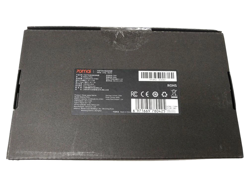 Марка: 70mai Модель: Midrive PS01 Цвет: черный Емкость: 11,100 мАч Пусковой ток: 250А Пиковый ток: 600А Тип C Вход: 5 В / 2 А Jump Start Выход: DC 12 В Выход USB: 5 В постоянного тока / 2,4 А Материал: ПК + ABS Режим светодиодного фонарика: освещение, вспышка, SOS Размер: 163 * 87 * 27 мм Тип зажима: защитные умные зажимы Рабочая температура: -20 ℃ ~ + 55 ℃ Температура зарядки: 0 ~ 55 ℃ Время полной зарядки: ≤5.5ч Сертификация: CE / FCC / RoHs