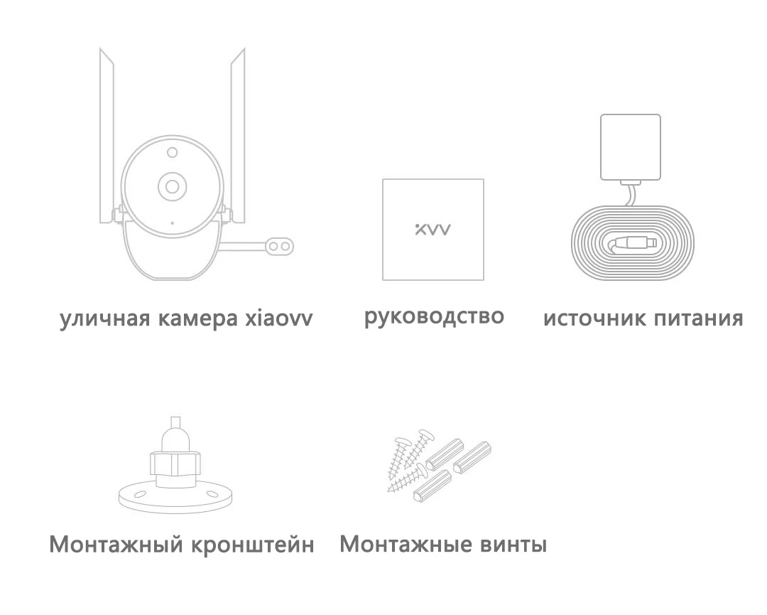 1 х Xiaovv широкоугольная наружная камера 1 x Монтажные кронштейны 1 х адаптер питания 1 x Краткое руководство 1 х Винтовая сумка для инструментов