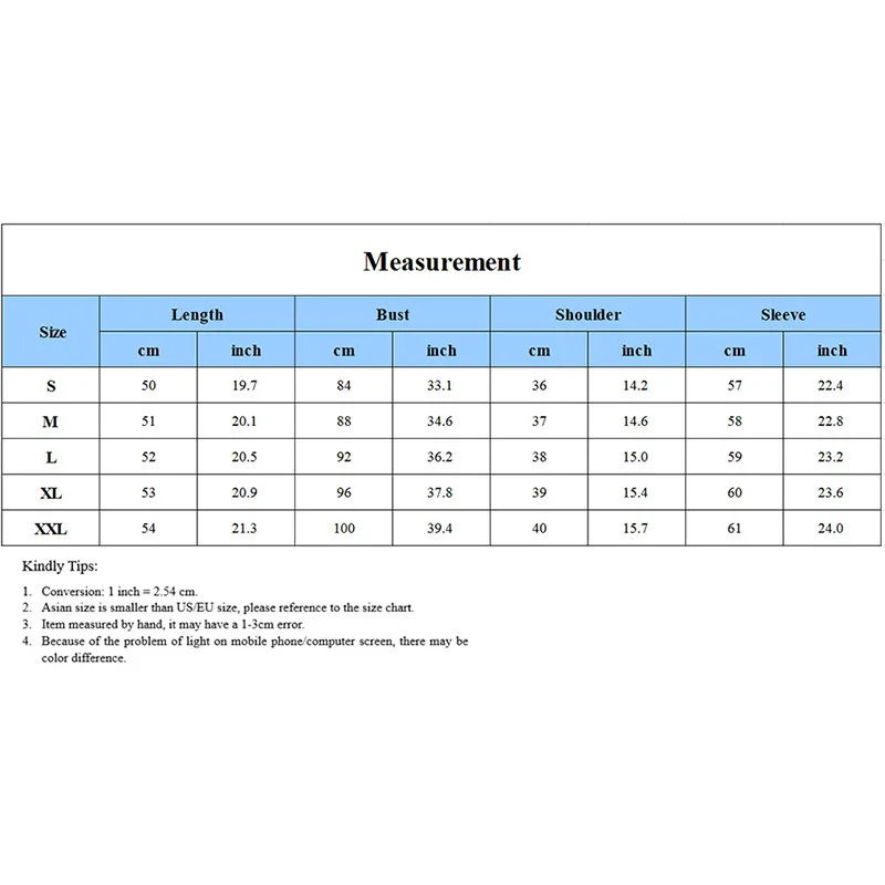 Длина Рукава Обхват груди - - S 50 см 57 см 84 см - - М 51 см 58 см 88 см - - L 52 см 59 см 92 см - - XL 53 см 60 см 96 см - - 2XL 54 см 61 см 100 см - - Пожалуйста, обратите внимание: 1. Напоминаем, что из-за световых эффектов, настроек яркости/контрастности монитора и т. Д. Могут быть некоторые незначительные различия в цвете тона фото на сайте и фактического товара. 2. Измерения вручную, могут отличаться на 1-3 см, мы будем очень признательны за понимание.