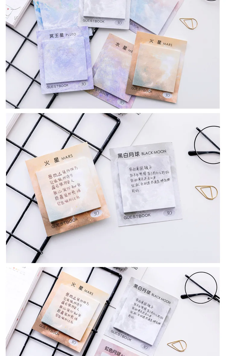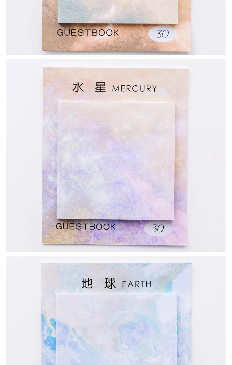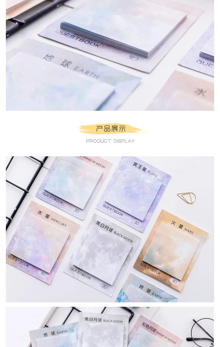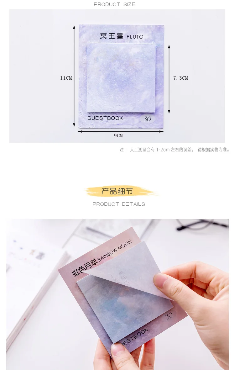 Характеристика: Название: серия Planets Милая кавайная блокнот для заметок, клейкая закладка для заметок, наклейки для студентов, Канцтовары для офиса и школы Тип: Липкие заметки Стиль: Серия planets Материал: бумага Размеры: 7,3 см x 7,3 см (прибл.) Цвет: как показано на фотографиях Примечания: 1. Благодаря светильник и экрана Цвет Товара может быть s светильник ly отличается из-за характеристик монитора компьютера. 2. Возможны незначительные отклонения в размерах из-за различных измерений вручную. Посылка включает в себя: 1 x Липкие заметки (30 листов)
