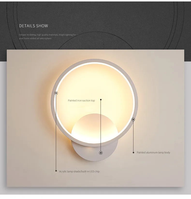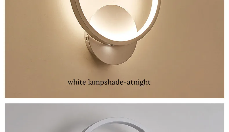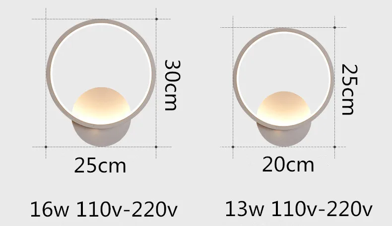 Особенности Высокое качество металла и алюминия Современный led стиль дизайн Подходит для прохода, коридора, столовой, спальни, лестницы, прикроватной кровати, арт-шоу-зала и т. д. Примечание: Обратите внимание, что допускается отклонение в диапазоне 1–3 см из-за проведения замеров вручную. Технические характеристики Товар: Настенные светильники настенные светильники бра Светильник источник: светодиодные полоски внутри Размеры: dia20cm dia25cm Напряжение: 110-220 В Мощность: 13 Вт 16 Вт Цвет корпуса: белый Комплектация: 1 настенная лампа