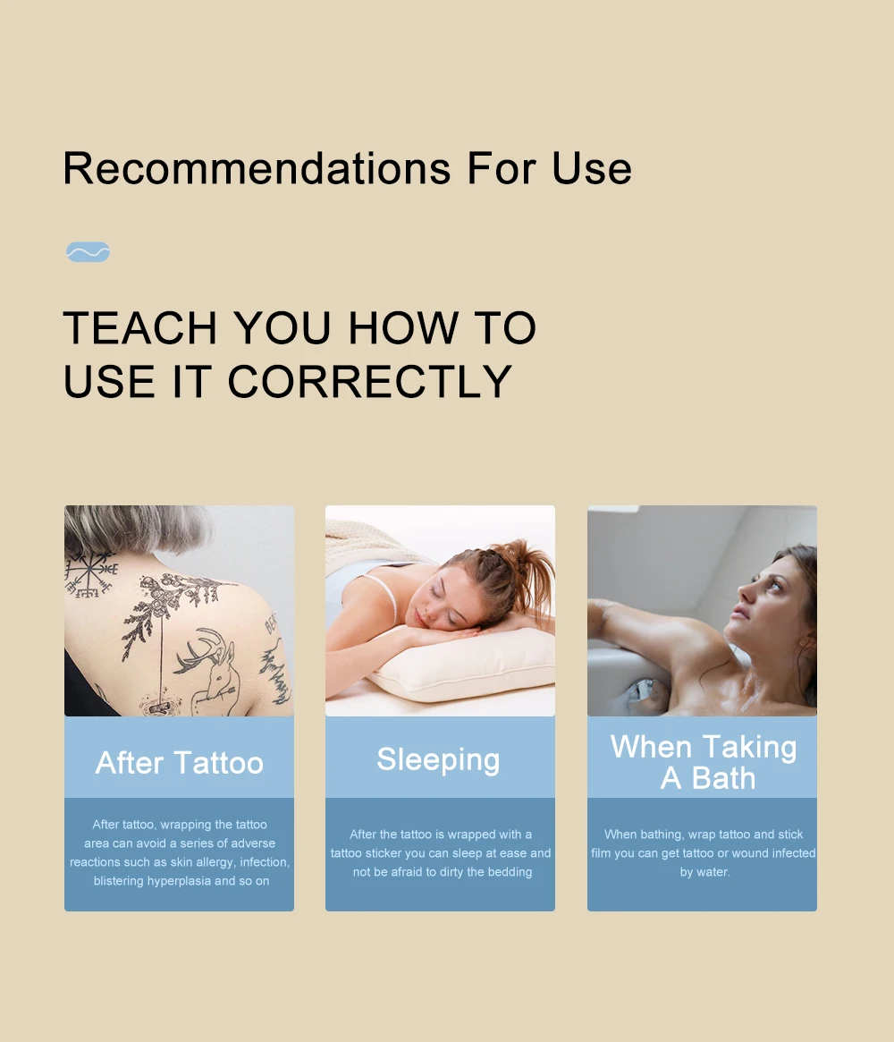 1. Вырежьте подходящий размер в соответствии с вашей татуировкой 2. Оторвите нижний слой 3. Наклейте тату-бандаж на кожу 4. Оторвите верхний слой