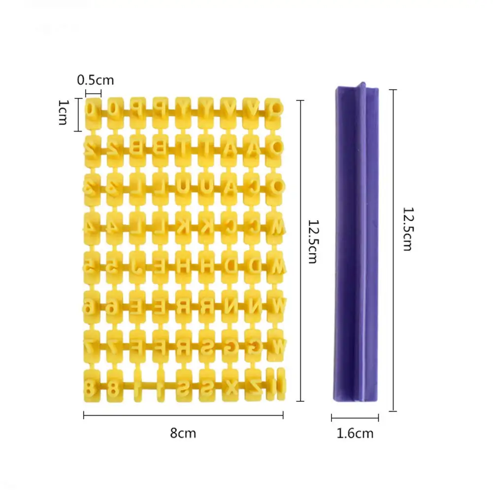 Easy to use and clean. Ideal for use with sugar paste, petal paste, marzipan or craft clays, etc. Material: Environmental protection level ABS materials, temperature up to 70. Massive 72pcs presses for DIY Letter & numbers dimension: Approximate 5mm