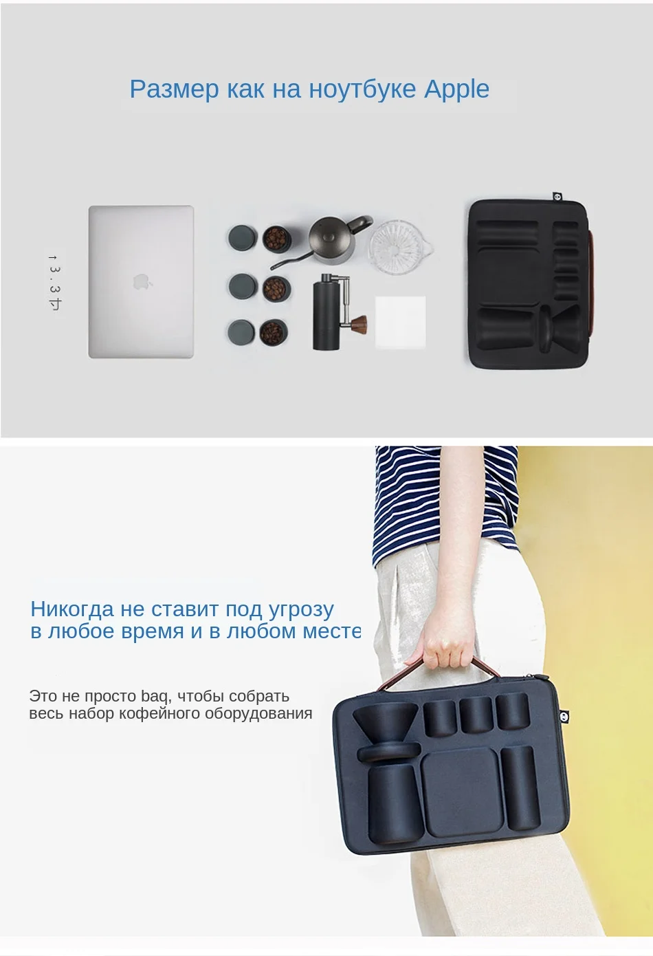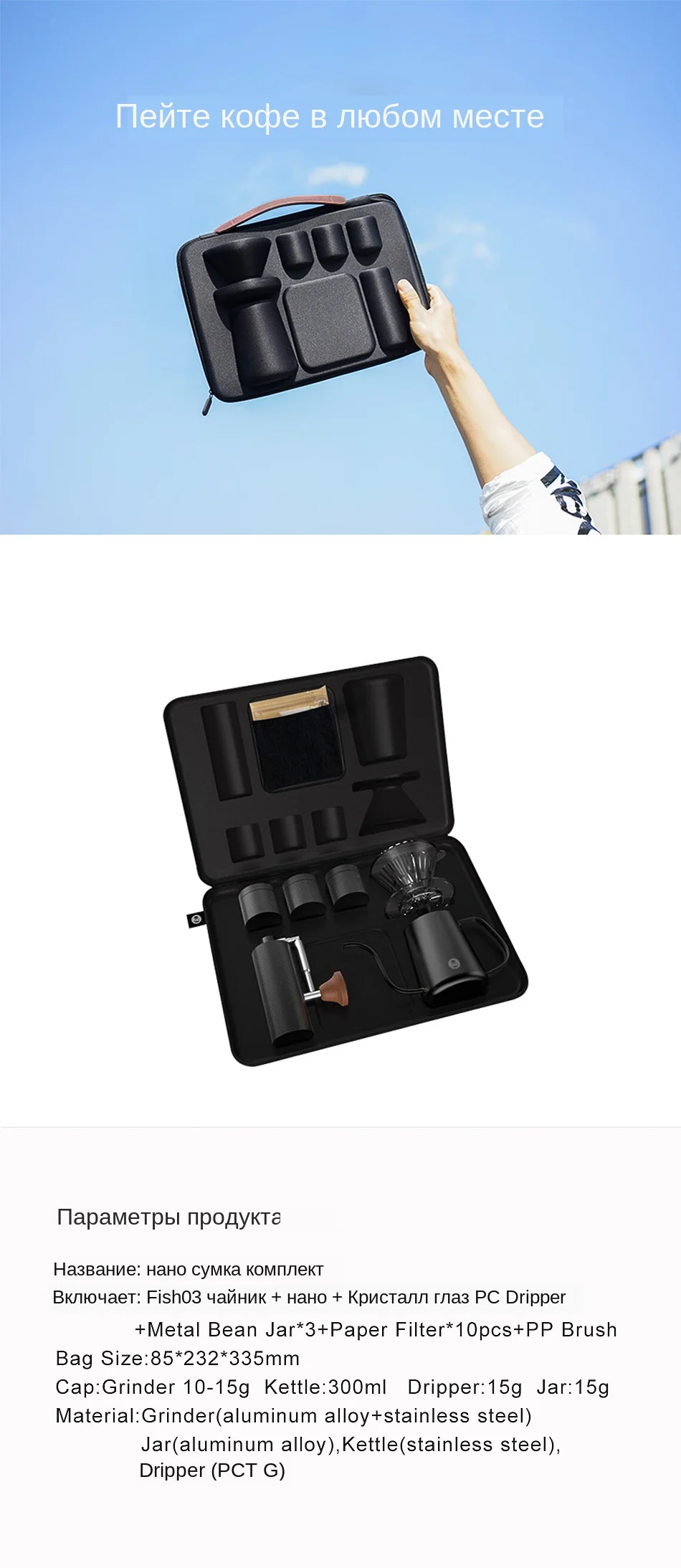 Название: нано сумка для переноски комплект Включает в себя: Fish03 чайник + Nano + Crystal Eye PC капельница + металлическая банка для бобов * 3 + бумажный фильтр * 10 шт + ПП мешок кисти Размер: 85*232*335 мм Колпачок: измельчитель 10-15 г Чайник 300 мл Капельница: 15 г Банка: 15 г Материал: шлифовальная машина (алюминиевый сплав + нержавеющая сталь) Банка (алюминиевый сплав), Чайник (нержавеющая сталь), Капельница (PCTG)