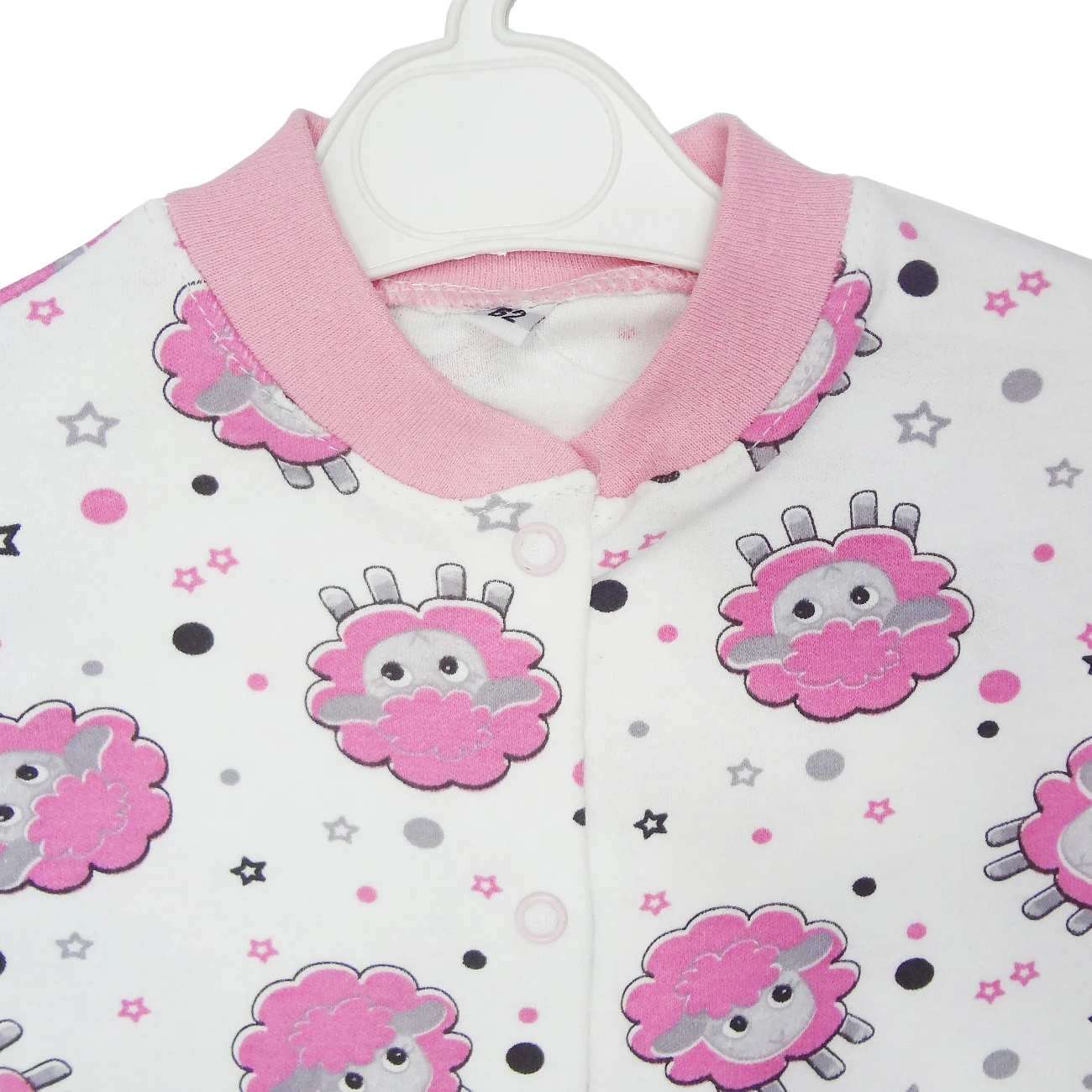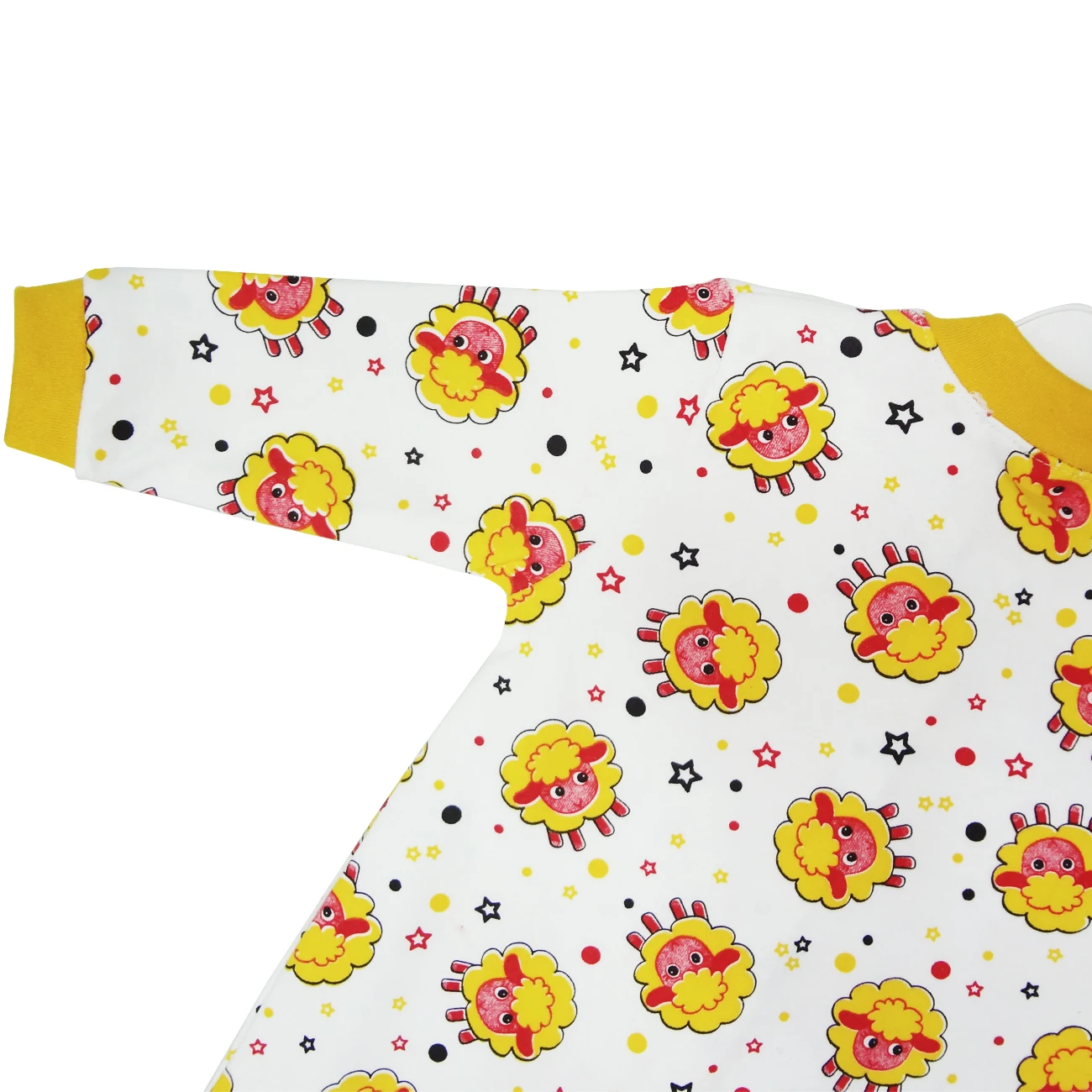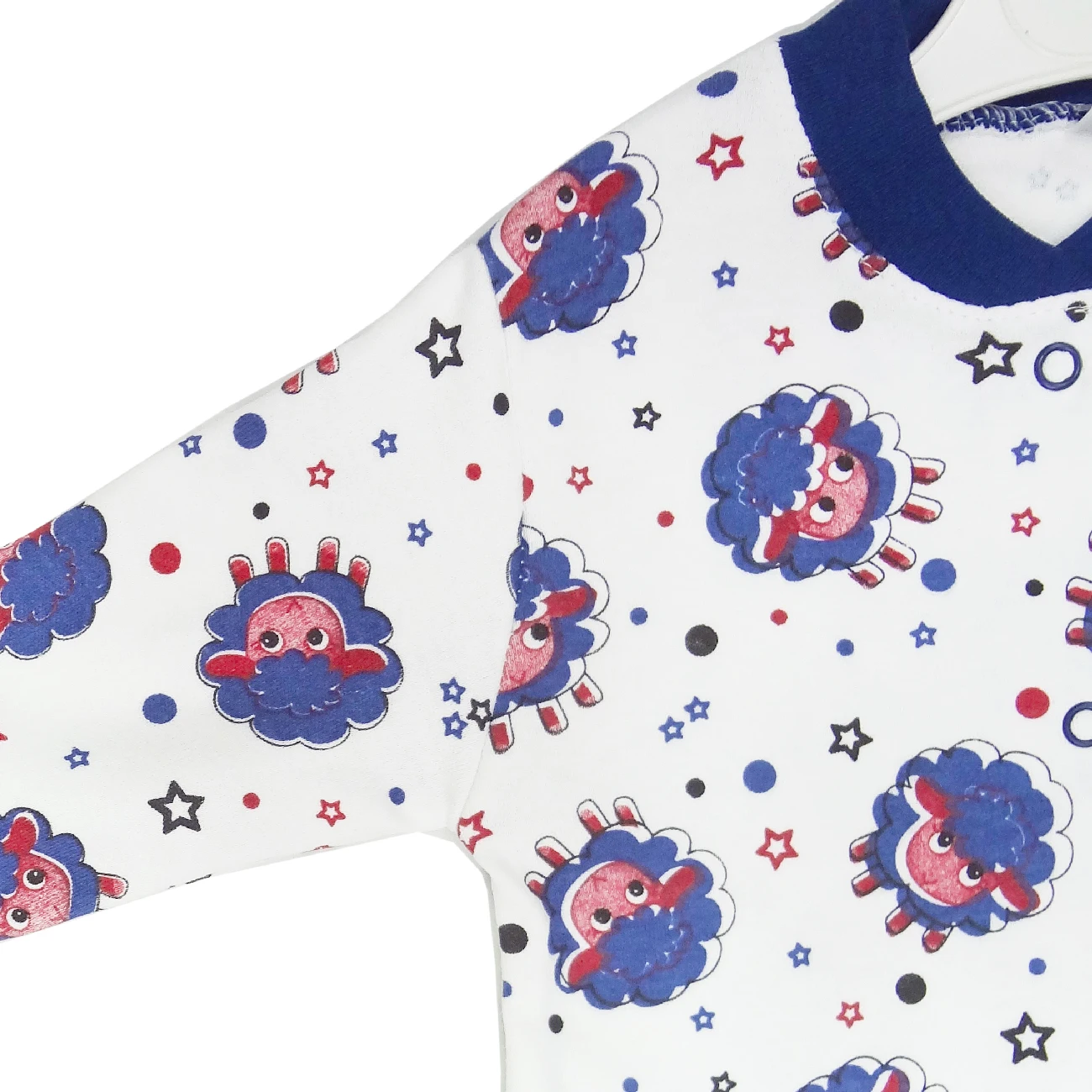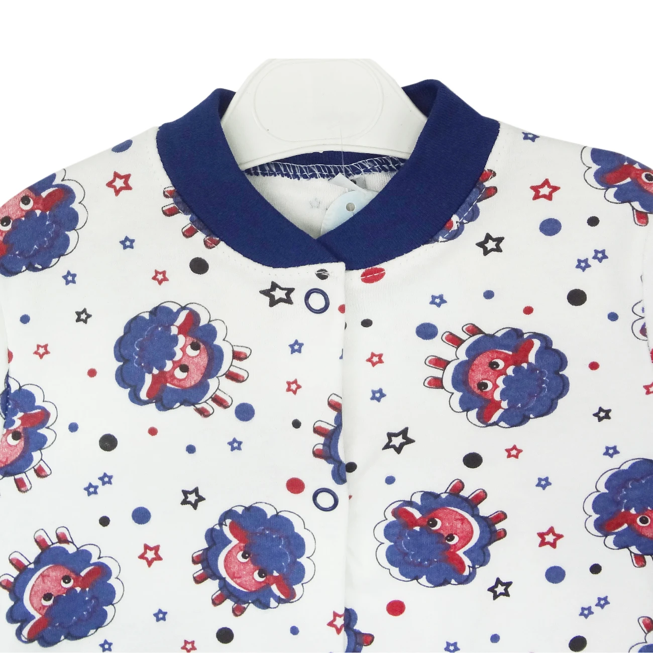 Пуговицы на кнопках, круглый воротник и длинный рукав завернуты ботиночками.