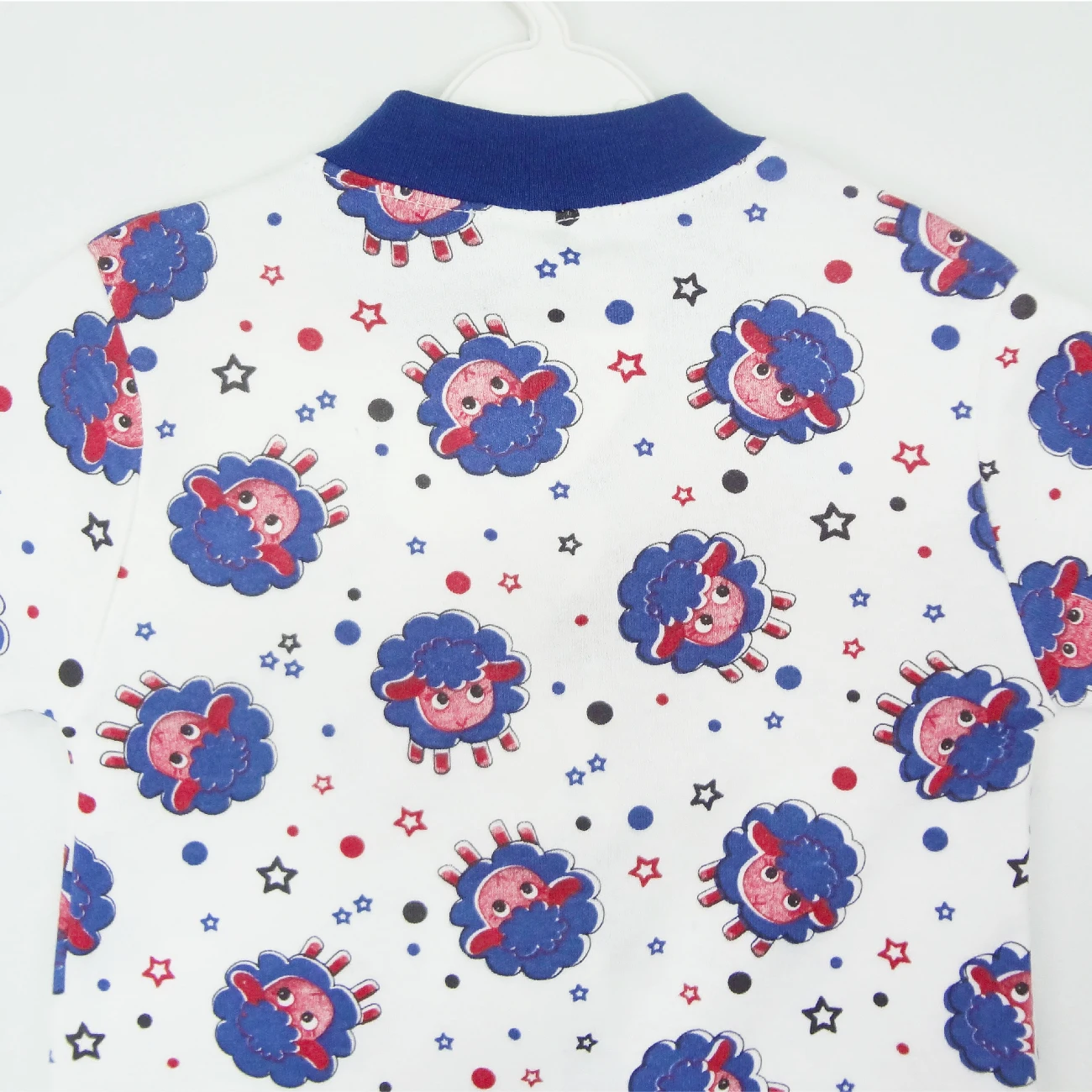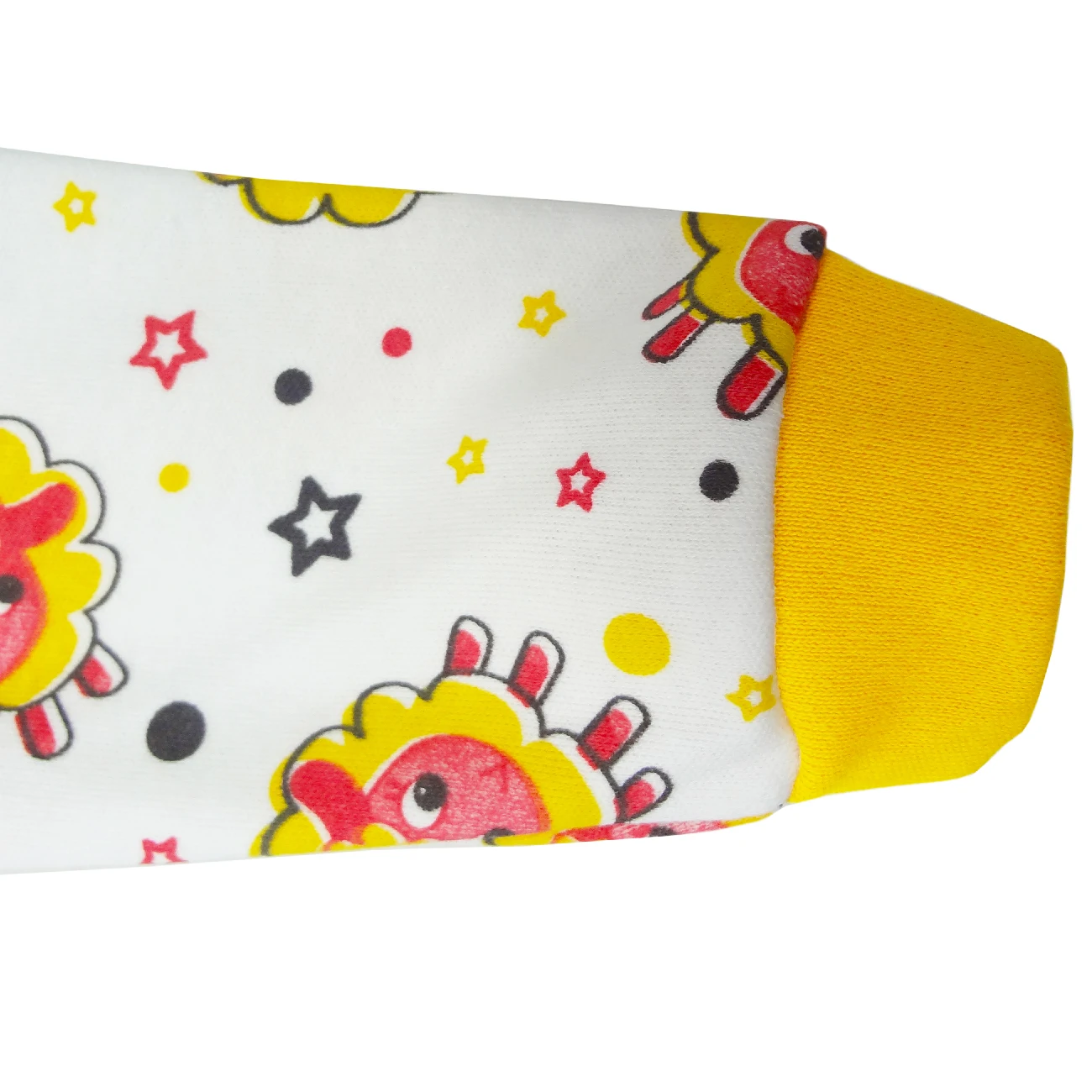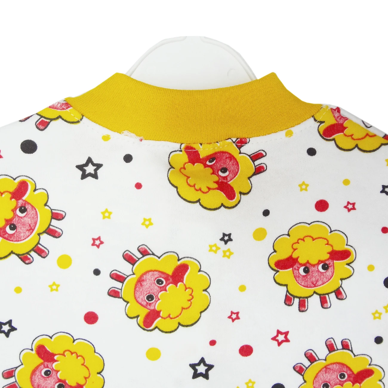 Пуговицы на кнопках, круглый воротник и длинный рукав завернуты ботиночками.