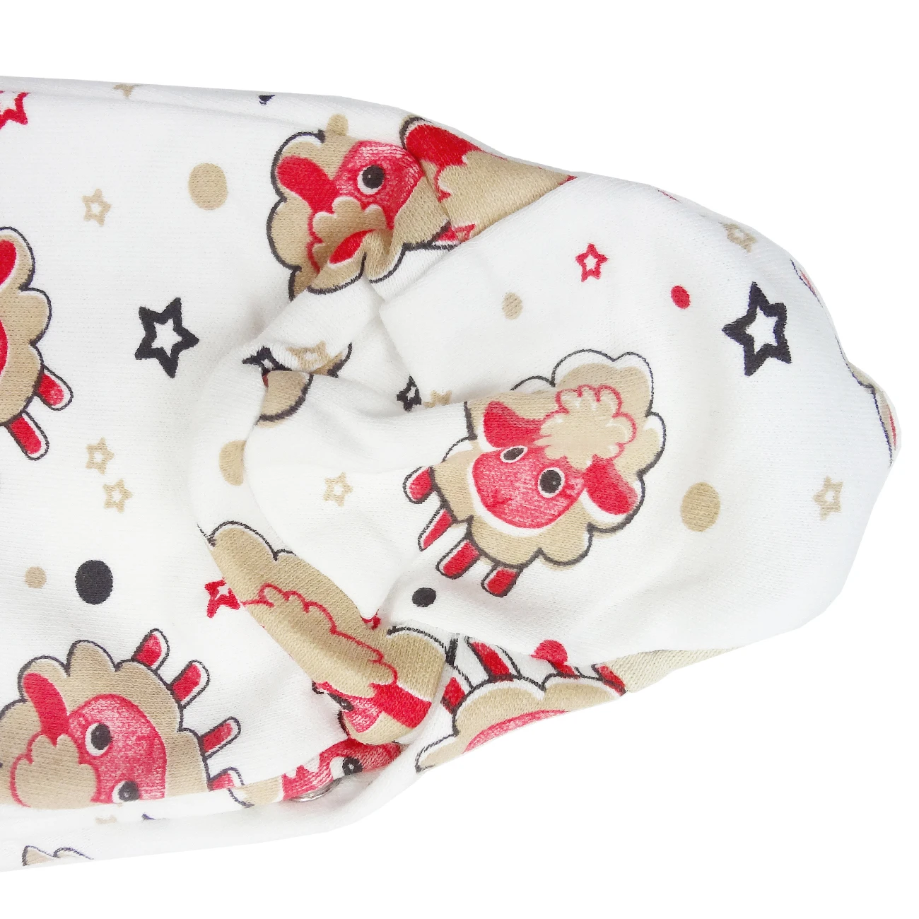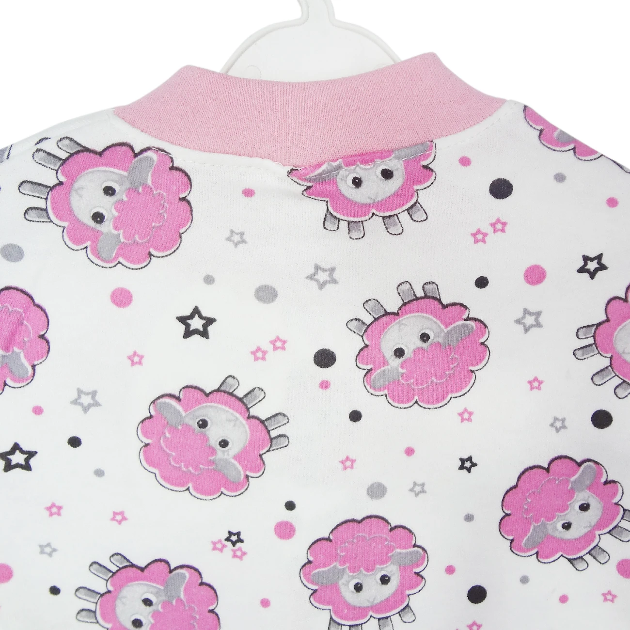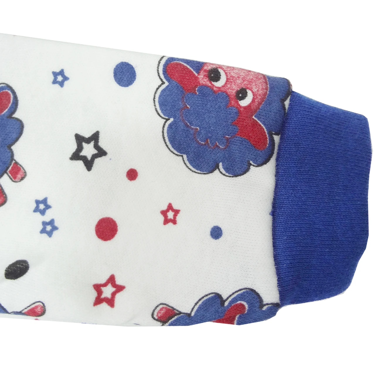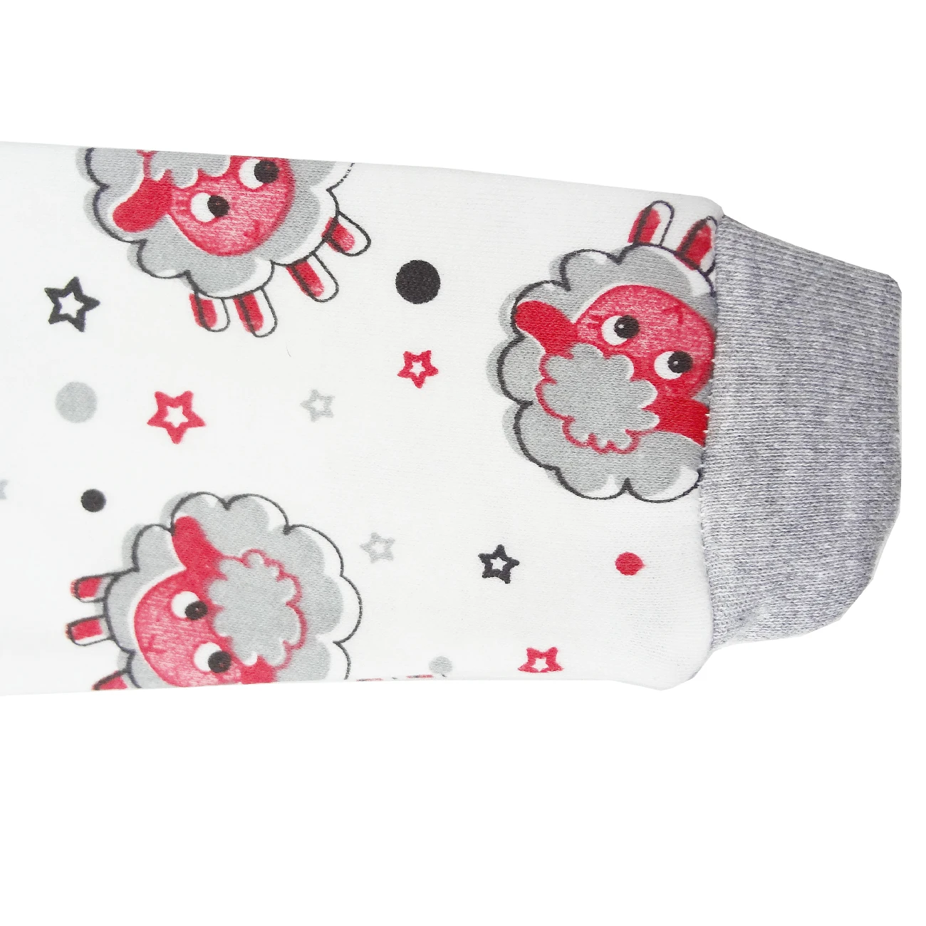 Пуговицы на кнопках, круглый воротник и длинный рукав завернуты ботиночками.