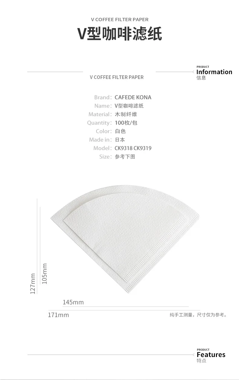 Название: V60 фильтровальная бумага для кофе Вместимость: 1-2 чашки/1-4 чашки Цвет: натуральный/белый Кол-во: 100 шт./упак. Происхождение: Япония Предназначен для V60 капельного стакана Характеристики продукта: 1. Натуральное древесное волокно, без добавления флуоресцентного агента или пигмента, может уменьшить повреждение кофейного аромата. 2. Высокотемпературное уплотнение кромки аккуратное, без использования клея, гладкое и тонкое, равномерный цвет 3. Прочность бумаги хорошая, не легко повредить, это хороший помощник специального кофе