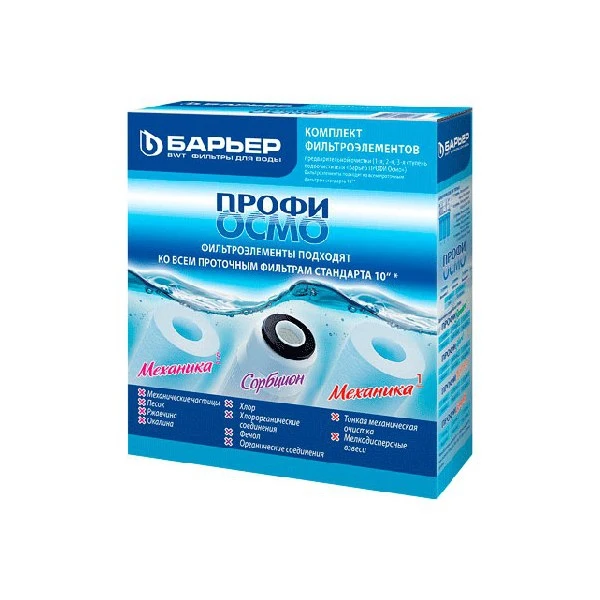 Комплект предварительной очистки для пятиступенчатой системы обратного осмоса. Защищает мембрану от механических взвесей, а также соединений хлора