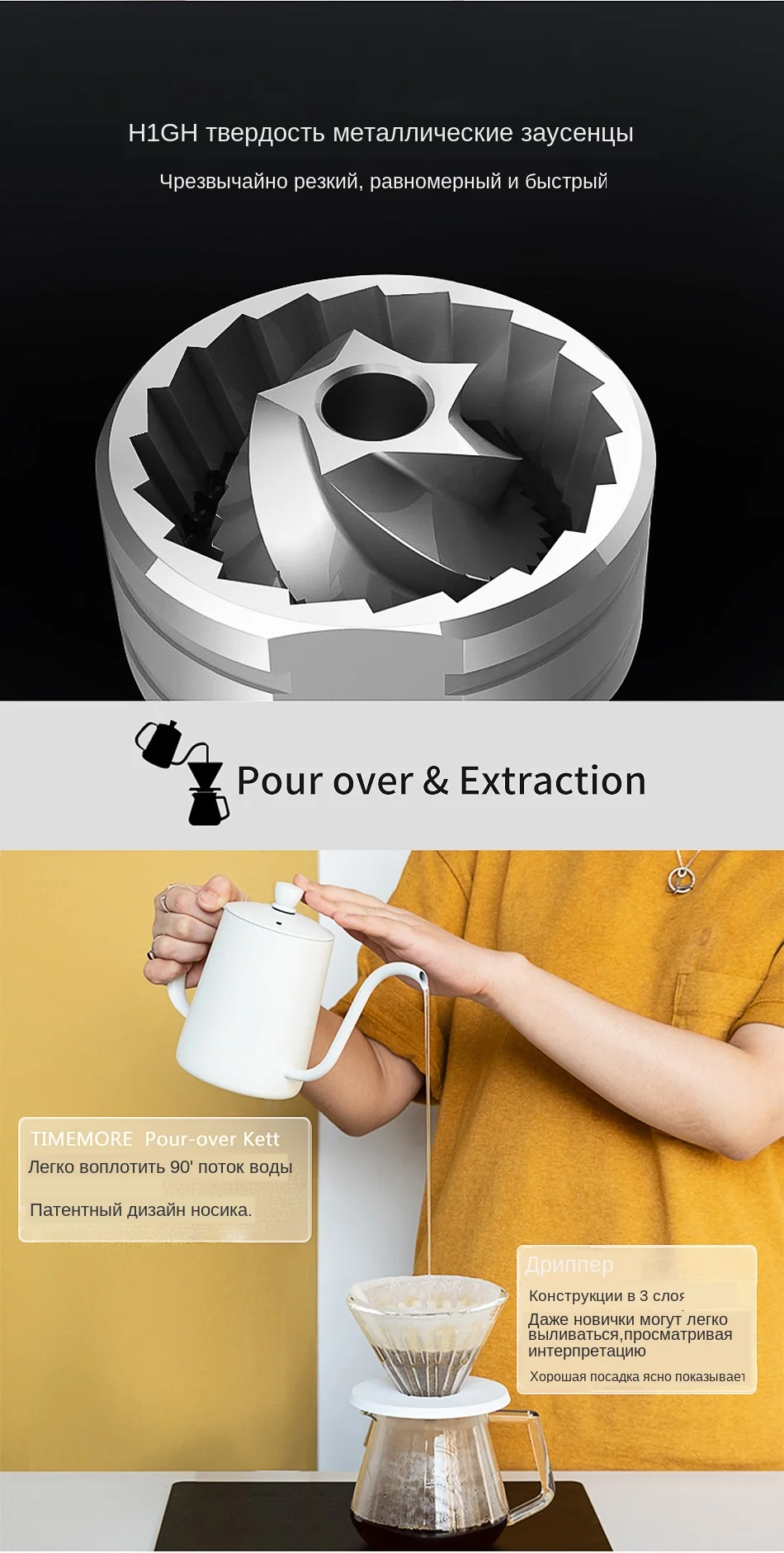 Включает: 1.Crystal Eye PC Dripper01 2. Серия кофе 360 мл 3. Каштан c кофемолка (черный/белый) 4. Чайник Fish03 600 мл (черный/белый) 5. PP щетка 6. V01 бумажный фильтр 10p