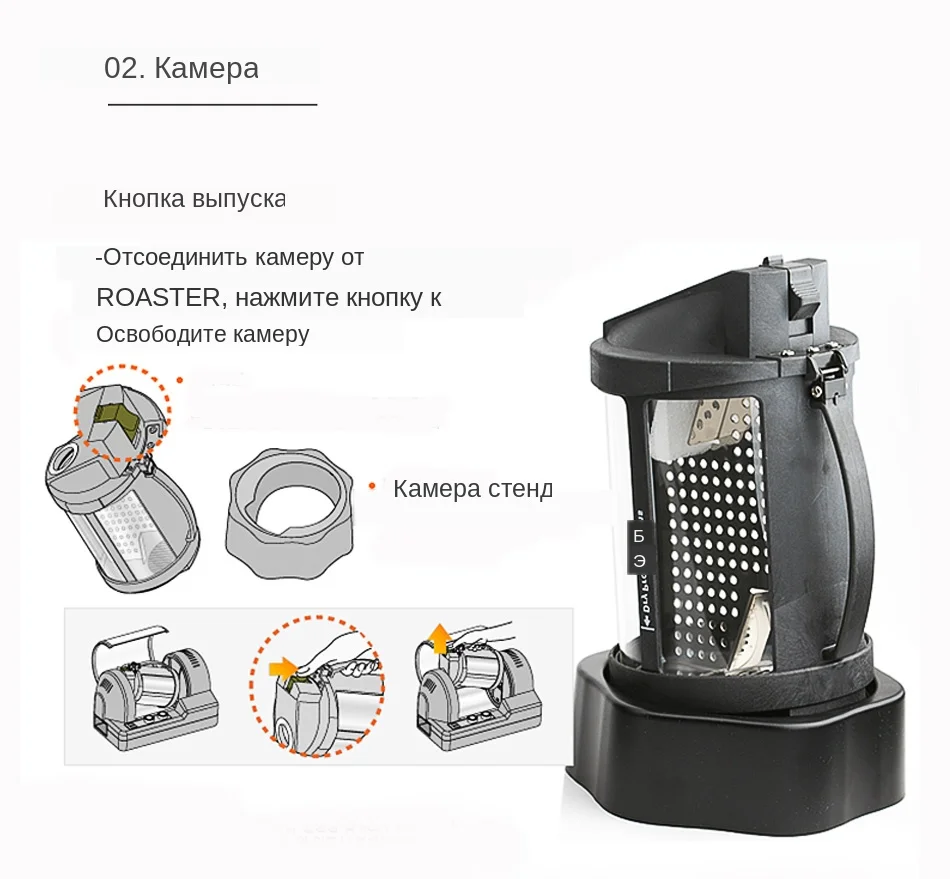 Переключатель спусковой кнопки фотографического Чтобы отсоединить камеру от жаровни, нажмите Кнопка для снятия камеры. Камера стенд Лезвие подушки Уменьшите удар лезвия. Лезвие подметает кофейные чаффы для выхода.