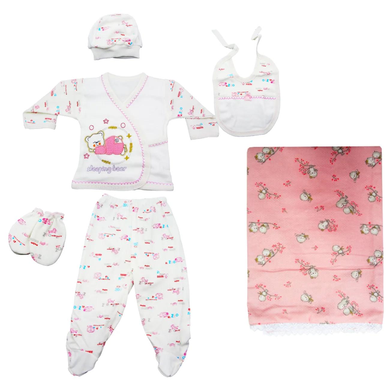 Комплект одежды для новорожденных мальчиков и девочек, 5 шт., % 100 хлопок и двухэтажное детское одеяло Fustian Набор Содержание 1 футболка 1 подштанники для девочек со штанами 1 головной убор 1 нагрудник 1 перчатка И 1 Одеяло Размеры 75x75 см