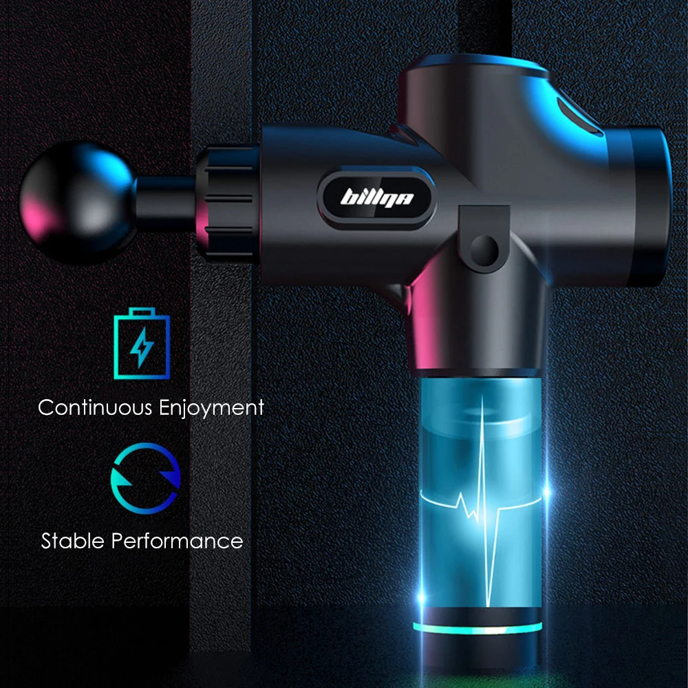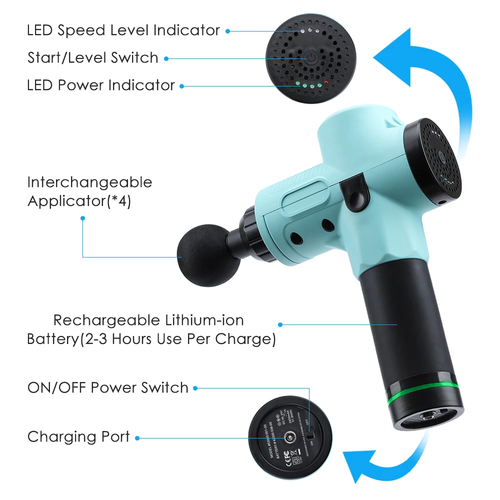 -Большинство профессиональных спортивных команд уже несколько лет используют высокочастотные массажные пистолеты. -- Если вам нужен действительно глубокий массаж, это продукт для вас. Если вы работаете в строительстве, сестринском, спорте, Кроссфите и т. Д. Или занимаетесь любым типом подъема или физически напряженной работой, вам это нужно! Если вы усердно работаете, у вас, вероятно, есть боль в спине и часто регулярный массаж, и большинство ручных массажеров просто не получают достаточно глубокого, тогда мы рекомендуем этот массажный пистолет для вас. -Это тихо. Тихий шепот по сравнению с другими массажными пистолетами. Есть три пользовательских настройки интенсивности, позволяющие вам фокусироваться-на глубокой тканевой работе, увеличенной циркуляции или подвижности. Каждая мышца отличается, различная форма, размер, функция. -- 4 массажных головки. Массажер может активировать мышцы, стимулировать кровоток, значительно уменьшить время восстановления мышц, облегчить боль и расслабиться от головы до ног. -Сменная Массажная головка позволяет вашему телу наслаждаться многоугольным массажем. Вы можете свободно регулировать угол, нажав на кнопку. Массажер помогает снять напряжение и облегчить боль, тугие мышцы, расслабить все ваши группы мышц, снять стресс и зарядить ваше тело. -- Низкий рабочий объем. Массажер работает до 30 дБ, так что просто расслабьтесь и наслаждайтесь тихим массажем! Компактный и легкий, массажер предназначен для плоских, маленьких и легко переносится. Массажер для мышц использует пульсирующие вибрации, чтобы обеспечить пользу для здоровья. -- Перезаряжаемая литиевая батарея. Массажер оснащен высококачественной литиевой батареей, и срок службы батареи длинный. Массажер для тела имеет светодиодный индикатор заряда батареи, поэтому вам не придется беспокоиться о отключении питания.