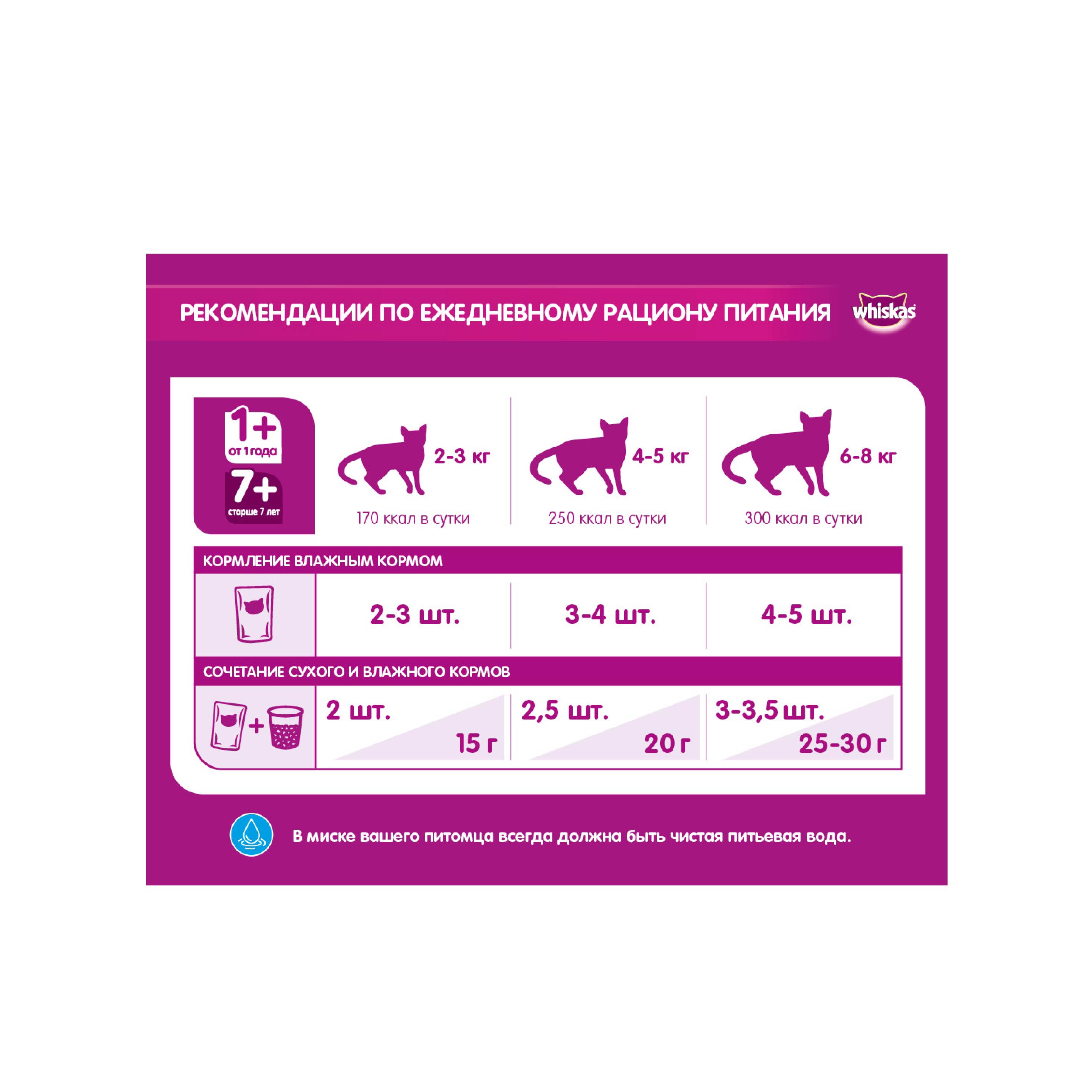 Whiskas® это: • Оптимальное сочетание питательных веществ и нутриентов для подержания обмена веществ • Витамин Е и цинк для иммунитета • Омега-6 и цинк для здоровья кожи и шерсти • Баланс кальция и фосфора для здоровья костей • Витамин А и таурин для хорошего зрения • Высокоусваиваемые ингредиенты и клетчатка для пищеварения • Сухая текстура корма для удаления зубного налета Whiskas® рекомендует сочетать разные форматы корма в рационе Вашей кошки.