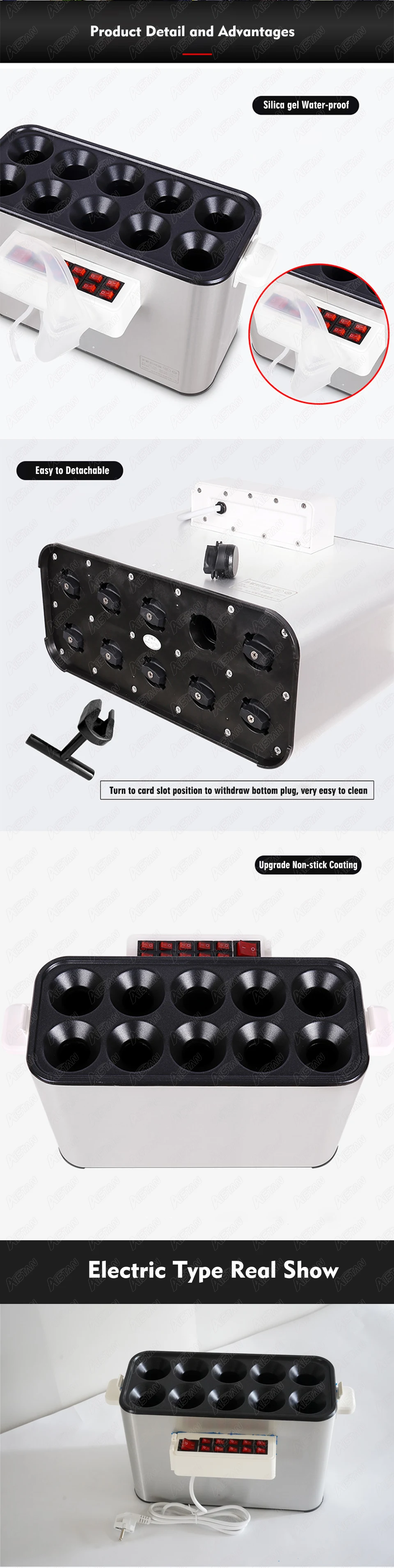 Электрическая машина для яичного рулона Размер: 420x210x235мм Мощность: 1400 Вт Отверстия: 10 Размер отверстия: 32x18 см