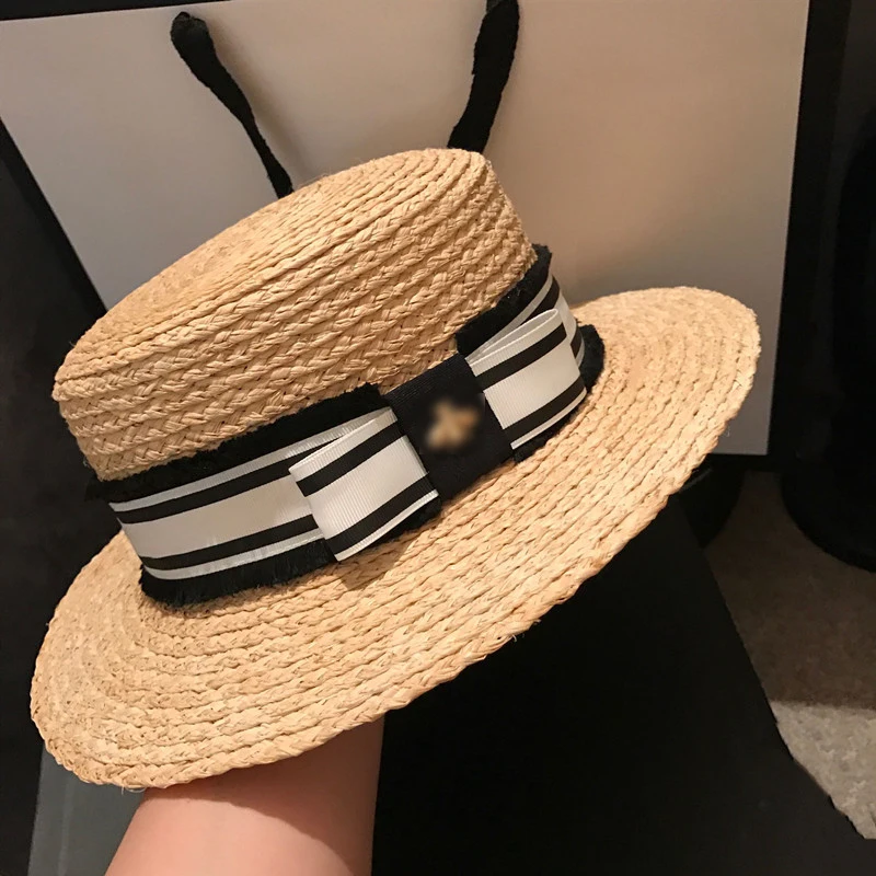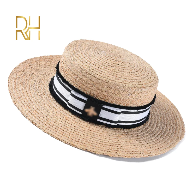 RH дамские летние кепки с козырьком и бантиком из рафии, соломенная плоская широкая шляпа для отдыха и путешествий