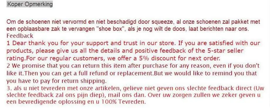 Советы: (1) выбранный вами размер-это размер обуви, а не размер Великобритании. ------(2) Если у вас полная и широкая стопа, пожалуйста, выберите больший размер. ------(3) Китайский размер обычно меньше, чем европейский размер. ------(4) Если вы не знаете, как выбрать, сообщите нам длину вашей стопы. ------(5) обычно мы не отправляем обувную коробку, чтобы снизить ваши затраты и быстрее пройти таможню. Если вы хотите отправить товар с коробкой, просто сообщите мне и оплатите 2 доллара США за каждую пару.