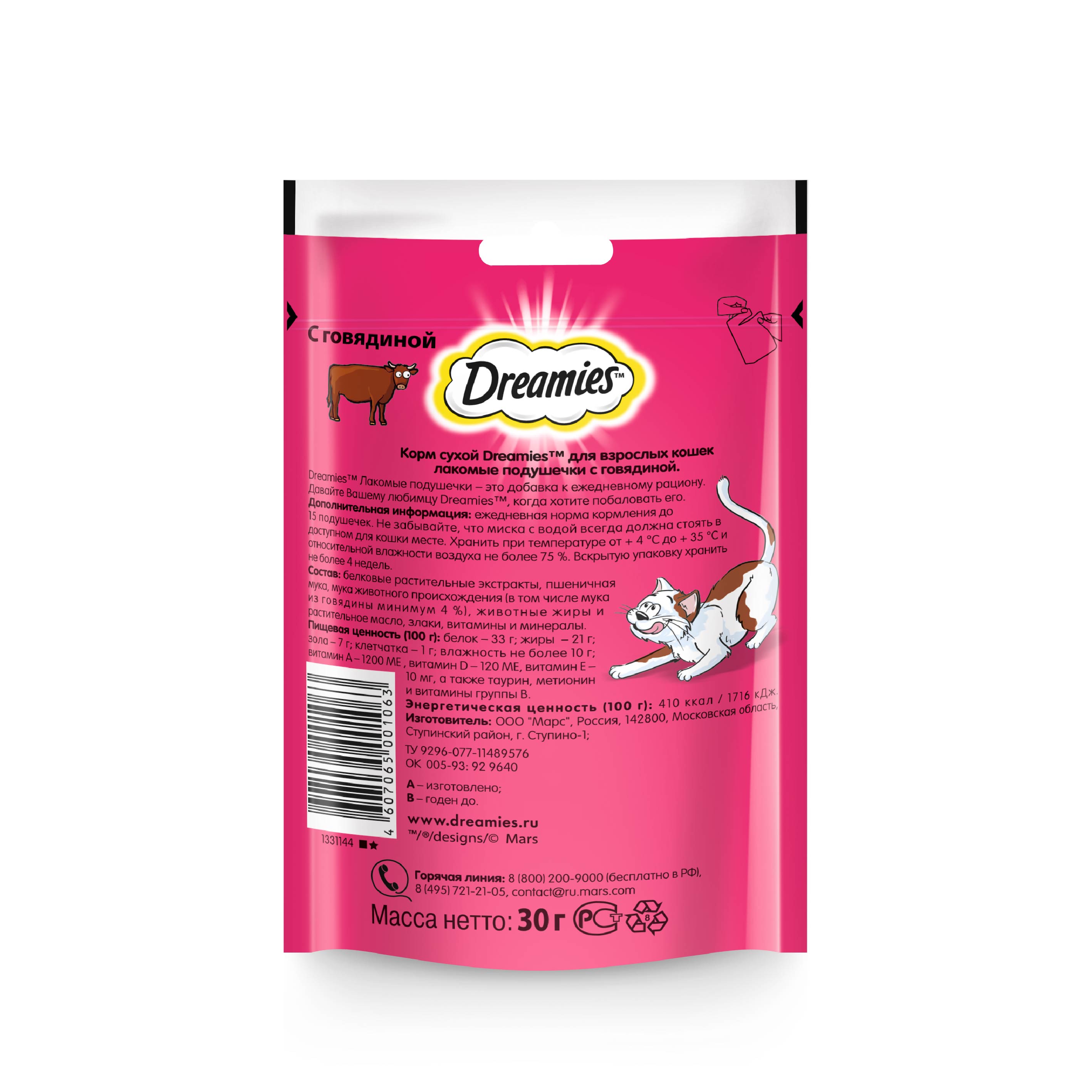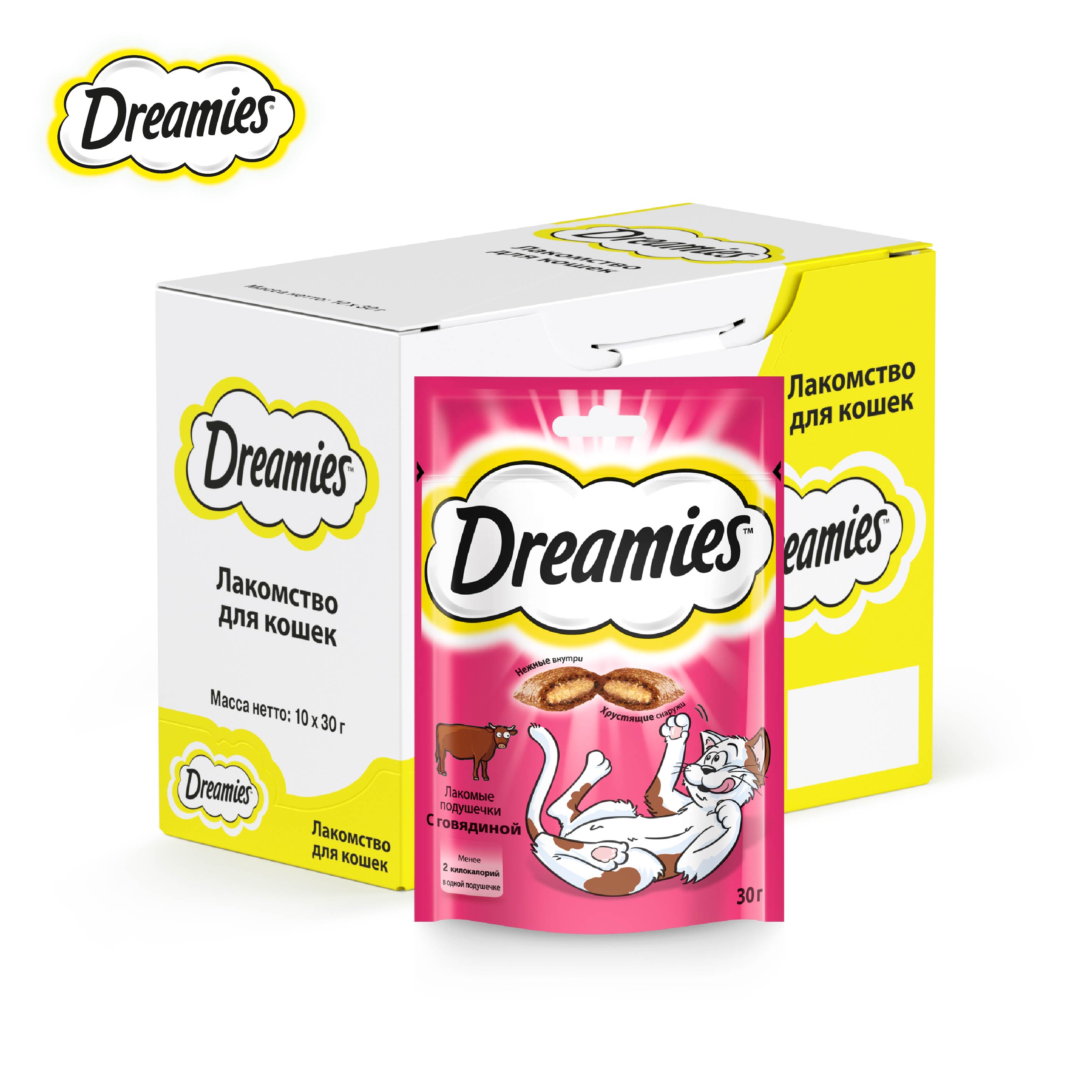 Лакомство для кошек Dreamies подушечки с говядиной, 10 ш по 30г