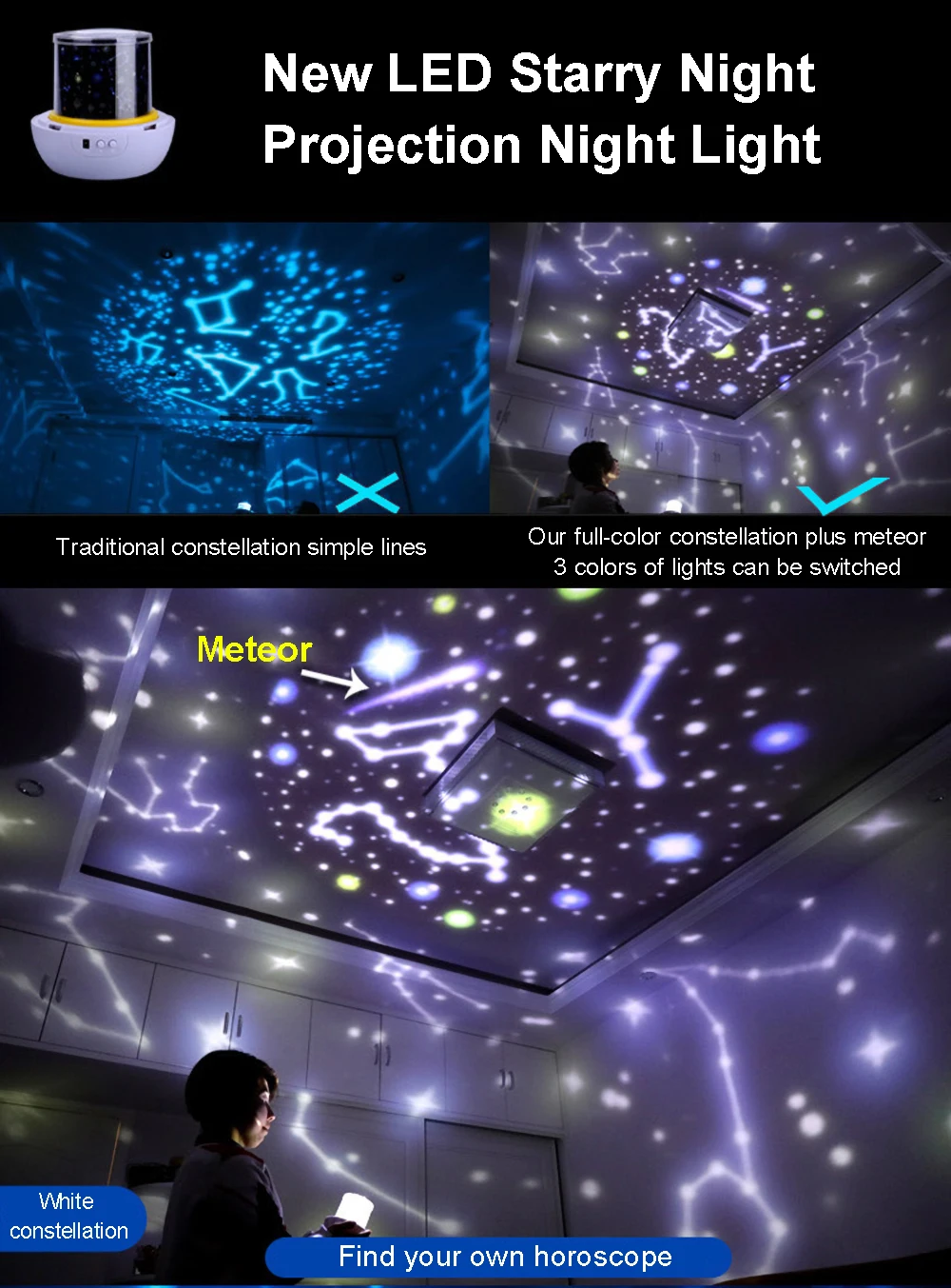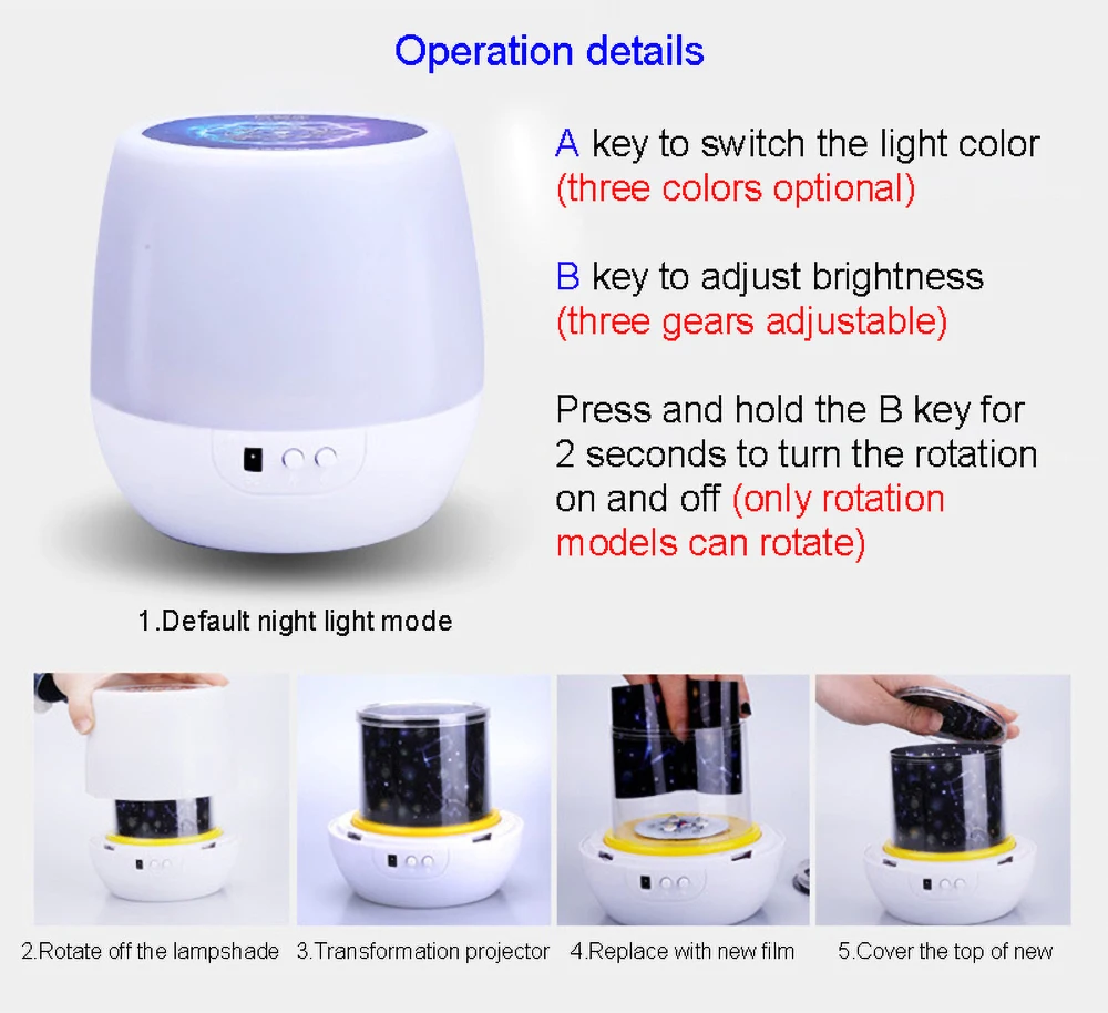 Параметры продукта:Название продукта: Красочный Звездный проектор, светильникМатериалы: абс + ПКЗатемнение: три уровня затемненияВес: 500 гЦвет крепления: белыйЦвет излучения: 3 цветаРазмер: 12,5*10,5*12,5 ммНапряжение: 5 В постоянного токаПоставка: USB/батарея 3 * AAA(Не входит в комплект)Количество светодиодов: 3 шт.Пленка: 5 комплектов пленкиПосылка комплект поставки входит:1 светодиодный ночсветильник1 USB-кабель1 руководство пользователя на английском языке1X посылка5X длинная прозрачность TP5X круглая прозрачность TPМне понравился дизайн, нечто похожее недавно видела в бутике. Но там босоножки стоили нереально, а на эти весьма посильная цена.... Читать отзыв полностью...