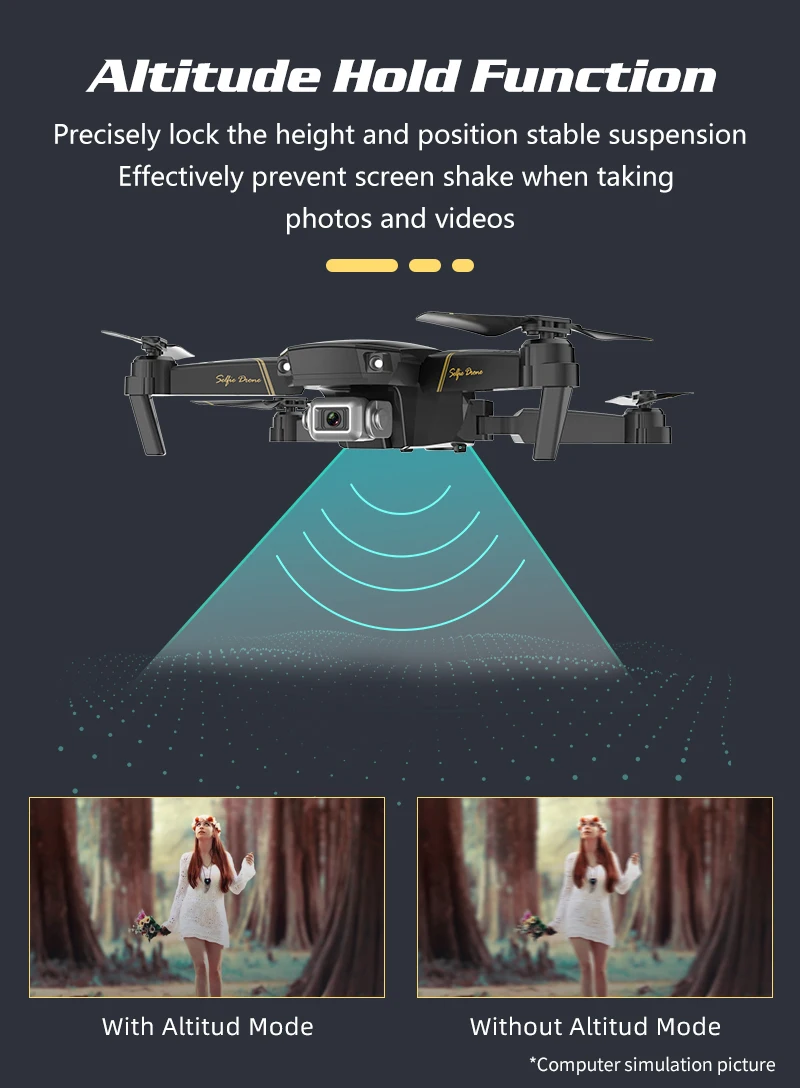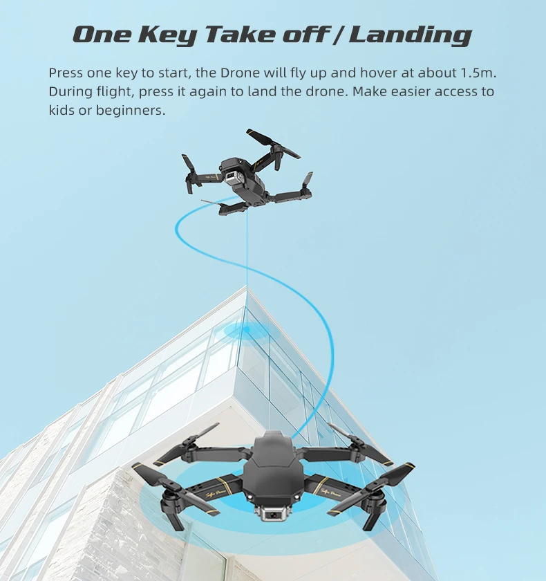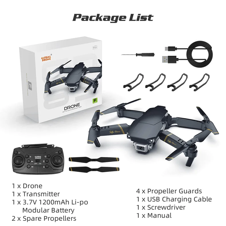 1. Объектив камеры: 90 ° 2. Расстояние передачи изображения Wi-Fi: 50 м 3. Разрешение видео и Разрешение фото: 480P (640*480); 1080P (1980х1080) 4. Частота кадров: 30 кадров в секунду 5. Формат фото и видео формат: JPG и MP4 /AVI 6. Версия системы мобильного устройства: iOS 9,0 или более поздней версии/Android 4,4 или более поздней версии 7. Регулируемая угловая Камера: регулируемая камера передатчиком, 45 ° 8. Аккумулятор дрона: 3,7 В 1200 мАч 9. Время полета: 15 минут; Время зарядки: 2 часа 10. RC: 2,4G (диапазон: 100 м;/аккумулятор: 1,5 в * 3) 11. Размер дрона: 28*20*5 см; Вес: 0,42 кг 12. Датчик давления (только 1080P включает)