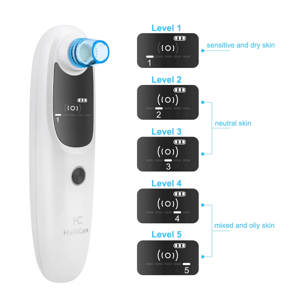 【Подходит для нескольких Needs】: Электронный очиститель пор HailiCare имеет 5 уровней всасывания, он может регулировать уровень всасывания, подходящий для всех типов кожи. Уровень 1 предназначен для чувствительной и сухой кожи, уровень 2-3-для нейтральной кожи, уровень 4-5-для смешанной и жирной кожи. И посылка поставляется с 5 видами сменных всасывающих зондов, которые идеально подходят для использования на каждой части лица.