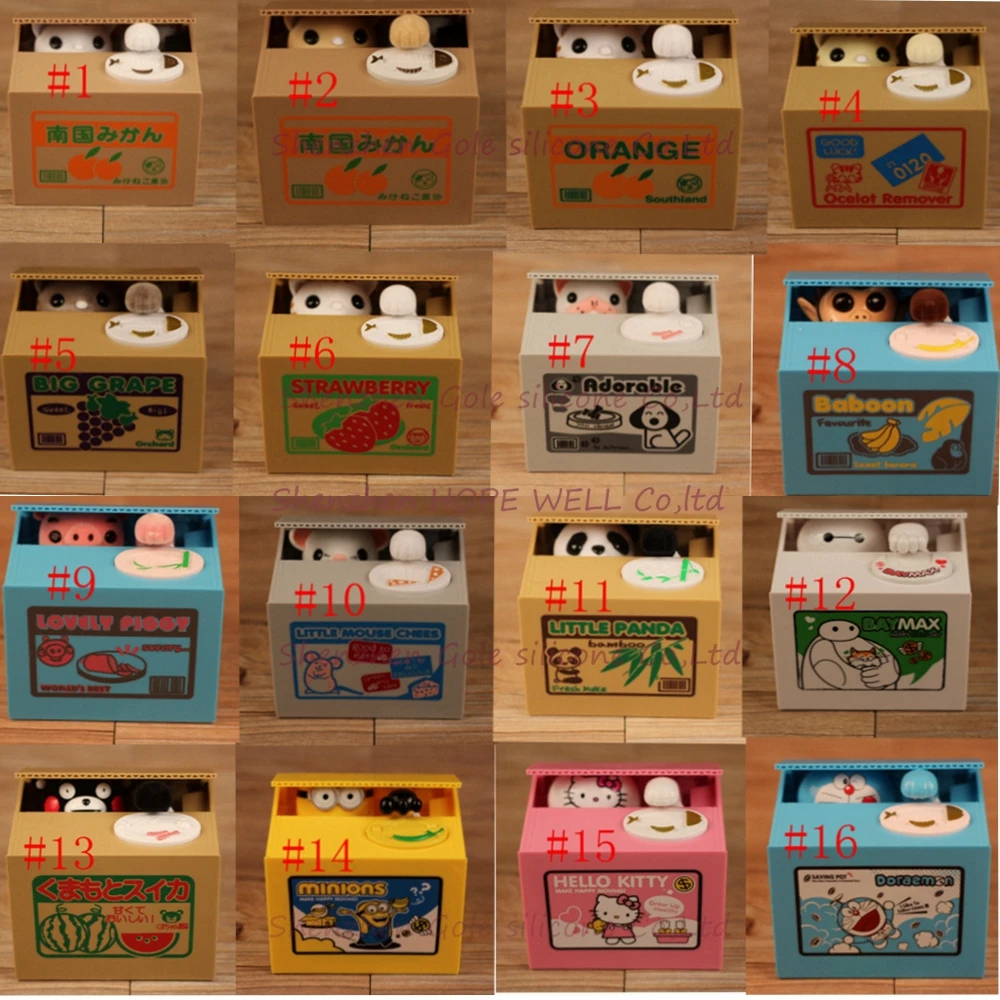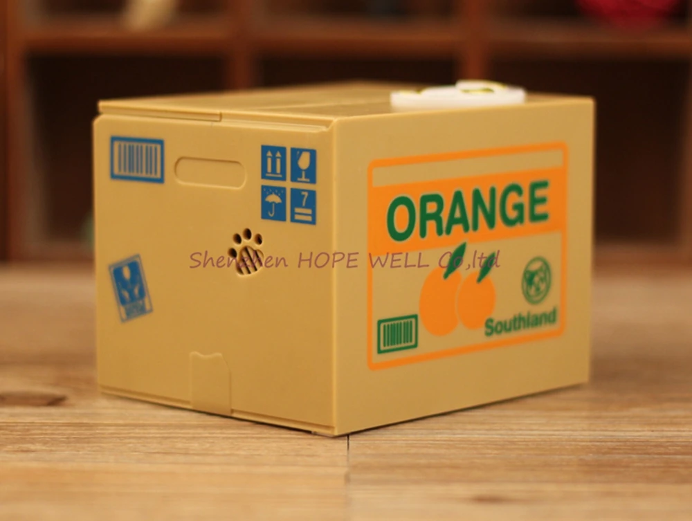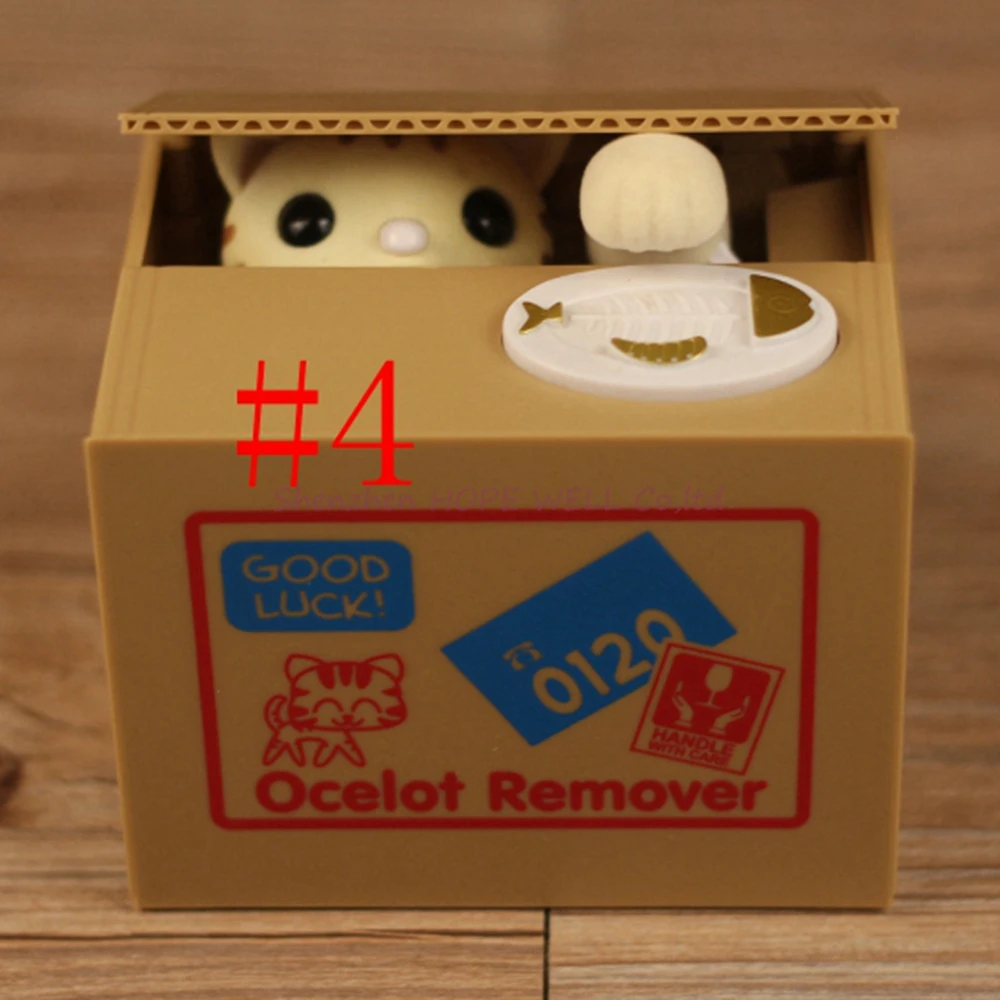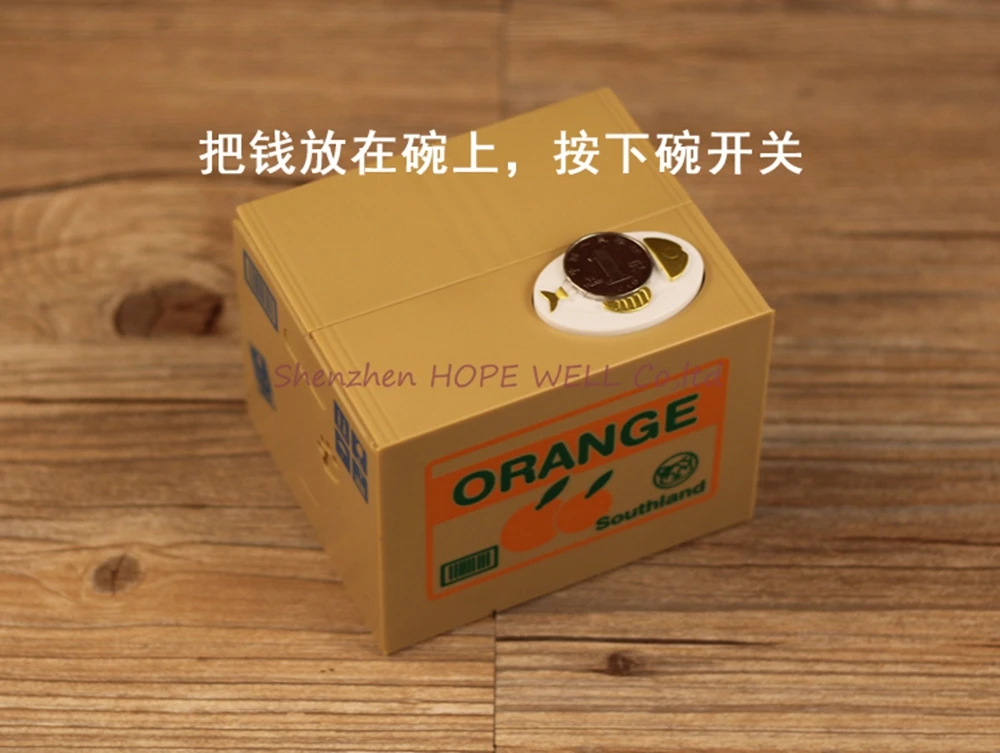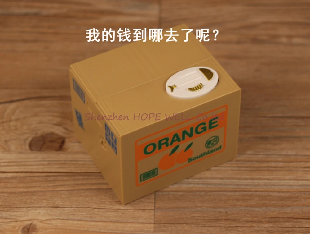 Это автоматически Монетный банк, который животное выйдет из картонной коробки и захватит ваши монеты из рыбной посуды.