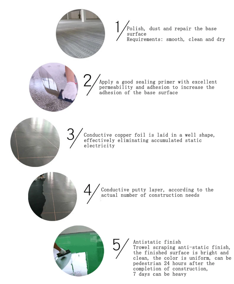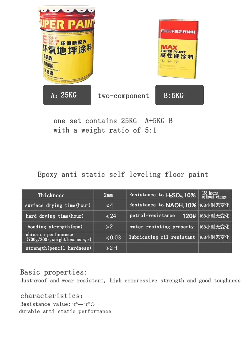 Антистатическая напольная краска состоит из грунтовки, медной фольги, среднего покрытия, отделки, 4 частей. Упаковка продукта и подходящая к ней Грунтовочное покрытие: 30 кг/группы, весовому соотношению = 1:1 дозировка ссылки: 0,2 кг/m2 Средняя Краска: 24 кг/группы, весовому соотношению = 4:1 дозировка ссылки: 0,2 кг/m2 Верхнее покрытие: 30 кг/группа, соотношение веса = 5:1 контрольная дозировка: 1 кг/м2
