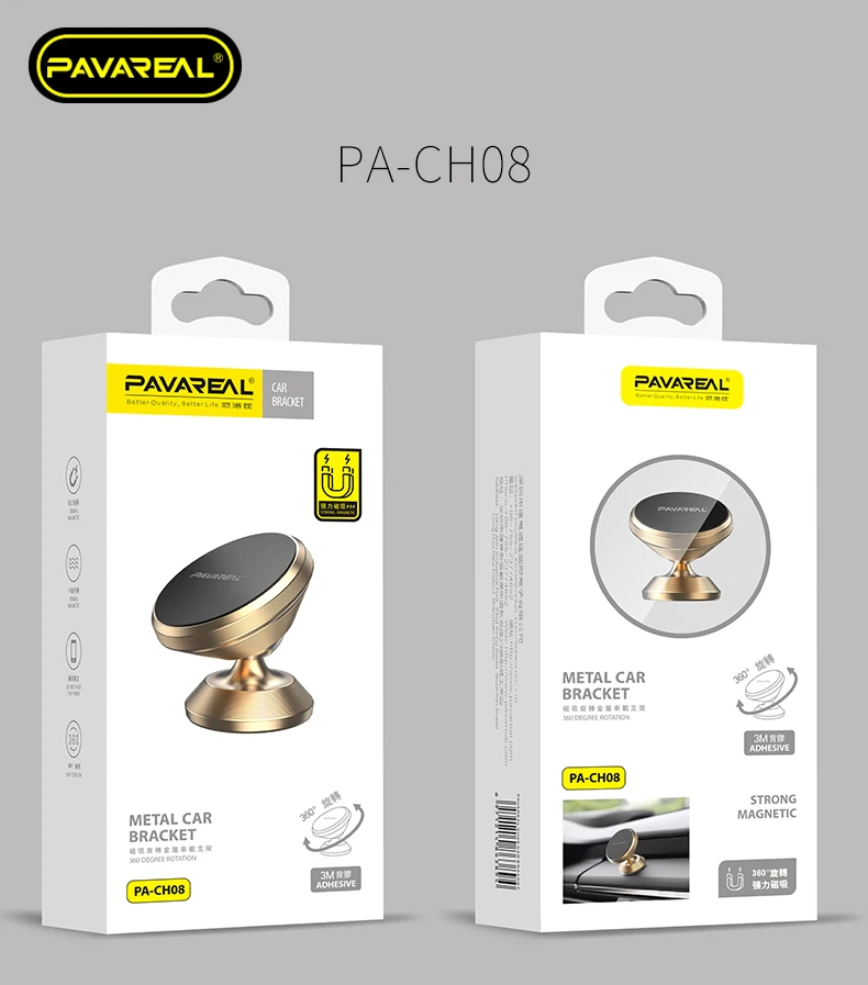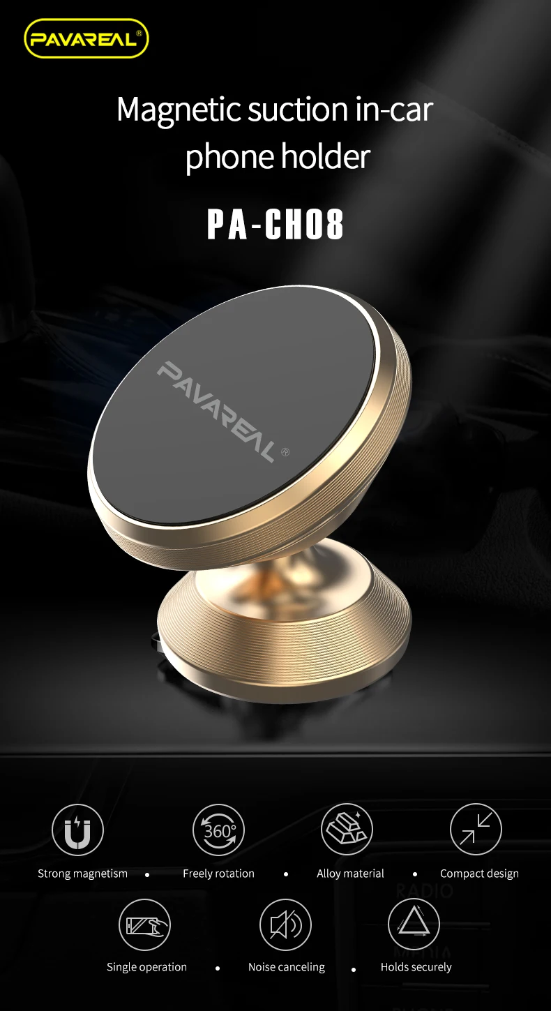 Параметры продукта Бренд: PAVAREAL Материал: сплав + силикон + магнит Цвет: Золотой Тип: магнит, ориентированный на палку Модель: PA-CH08 Применимое устройство: автомобили и телефоны Ремесло: металлические детали для этикеток + полировка