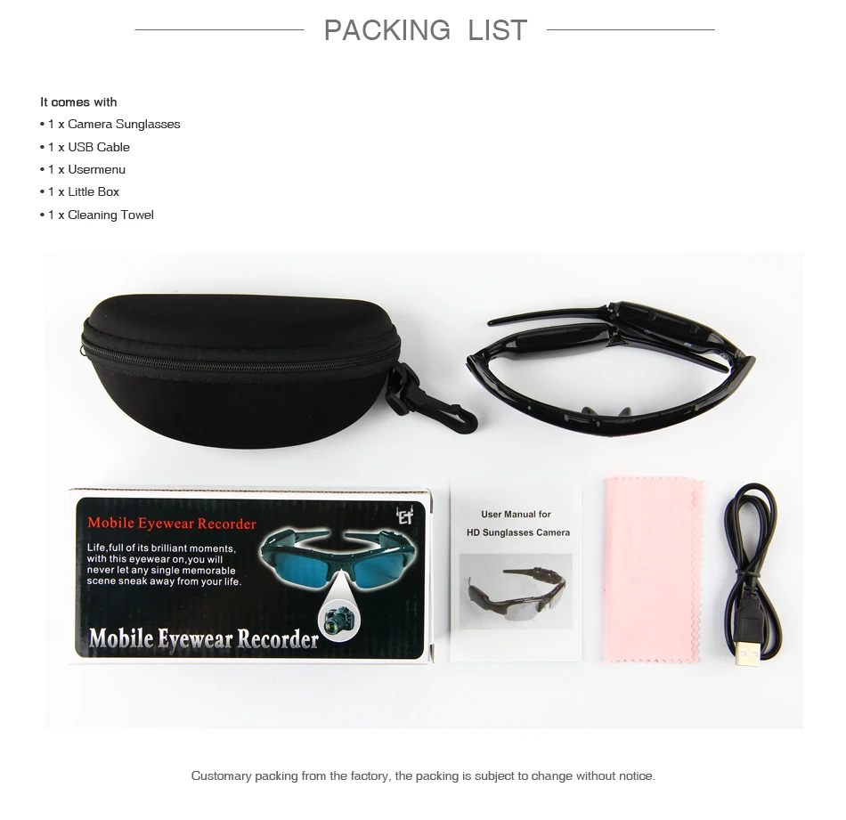 1. Этот продукт не поставляется с tf-картой, вы должны купить tf-карту самостоятельно. Пожалуйста, купите высокоскоростную tf-карту C10 до 32 Гб. 2. Видеокарта TF может считываться системой win10/8/7/Vista/XP, но при подключении солнцезащитных очков к компьютеру с помощью кабеля, данные доступны только для Windows me/2000/xp/2003/Vista/Mac os 10,4/Linux.