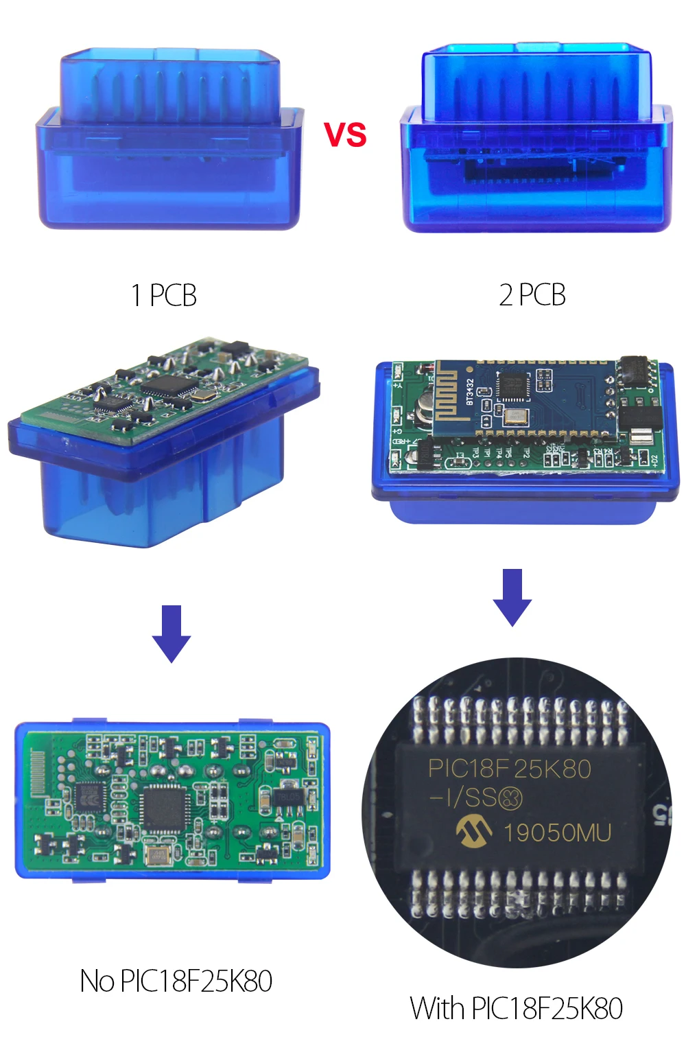 Этот ELM327 использует самую стабильную прошивку V1.5 с чипсетом PIC18F25K80 на двойных платах, чтобы fullfil большинство vehilces и функций.