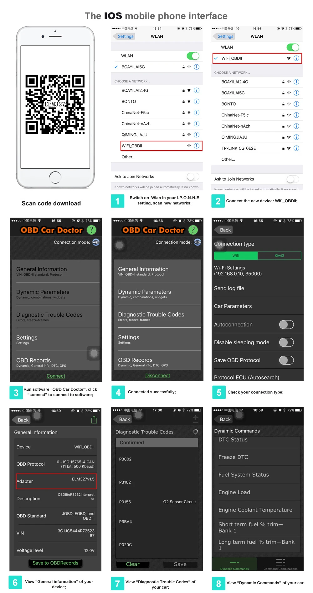 Buetooth ELM327: не поддерживает IOS, поддерживает только android телефон/ПК ---- подключение по bluetooth Wifi ELM327: поддержка телефона android, IOS, ПК ---- подключение через WIFI Внимание, пожалуйста: Из-за различных технологий bluetooth для смартфонов, пожалуйста, повторите подключение, если вы не можете успешно подключиться.