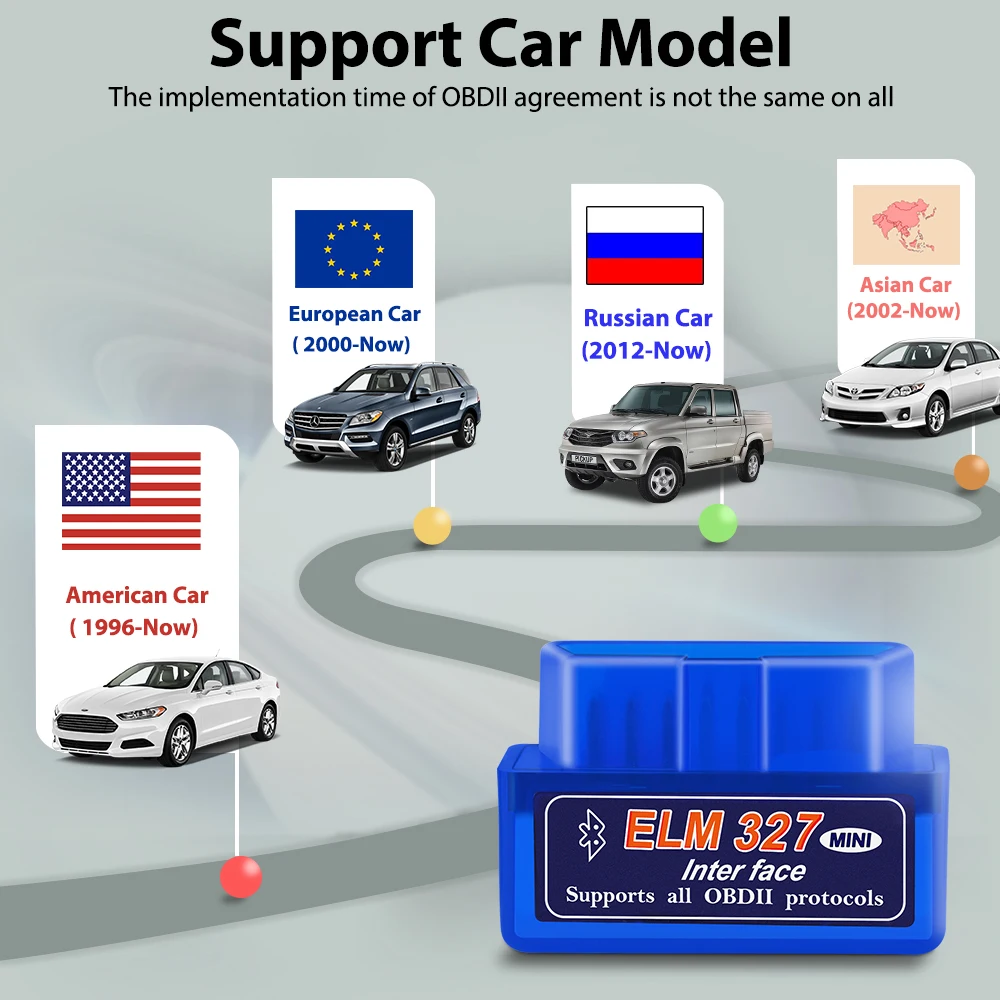 ● Американская автомобильная Поддержка автомобиля после 1998 года ● Европейская Автомобильная Поддержка автомобиля после 2000 года ● Азиатский автомобиль поддержки после 2002 года, (Япония и Корея и Китай и так далее) ● Поддержка российских автомобилей после 2012 года. (ВАЗ/УАЗ/газ автомобиль) ELM327 работает только с бензиновыми и дизельными автомобилями 12 В. Сначала проверьте модель автомобиля из списка.