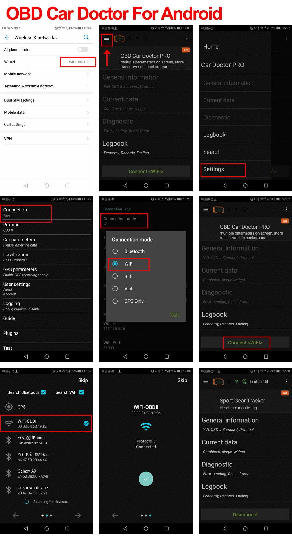 Пожалуйста, проверьте, Выбираете ли вы Wi-Fi Подключение как в настройках телефона, так и в программном приложении. ИВыйдите из программного обеспечения после завершения настройки, затем перезагрузите программное обеспечение,Автоматически подключается к адаптеру и автомобильному ЭБУ