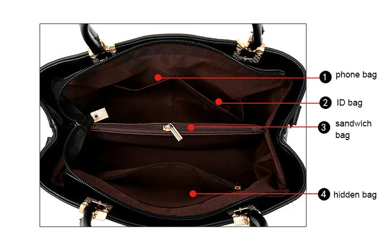 Внутренняя структура: мобильный телефон, сумка для удостоверения личности, сэндвич-сумка, скрытая сумка.