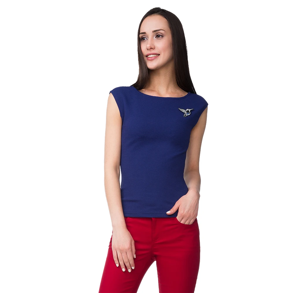 Топ облегающего кроя плотно сидит на теле, очерчивая силуэт и подчеркивая изгибы женской фигуры. Модель выполнена из эластичного фактурного трикотажа. Широкий вырез-лодочка акцентирует внимание на шее и ключицах. Модель декорирована изящной аппликацией в виде колибри, украшенной граненым элементом. Рекомендуем сочетать топ с юбками любого фасона и повседневными брюками.
