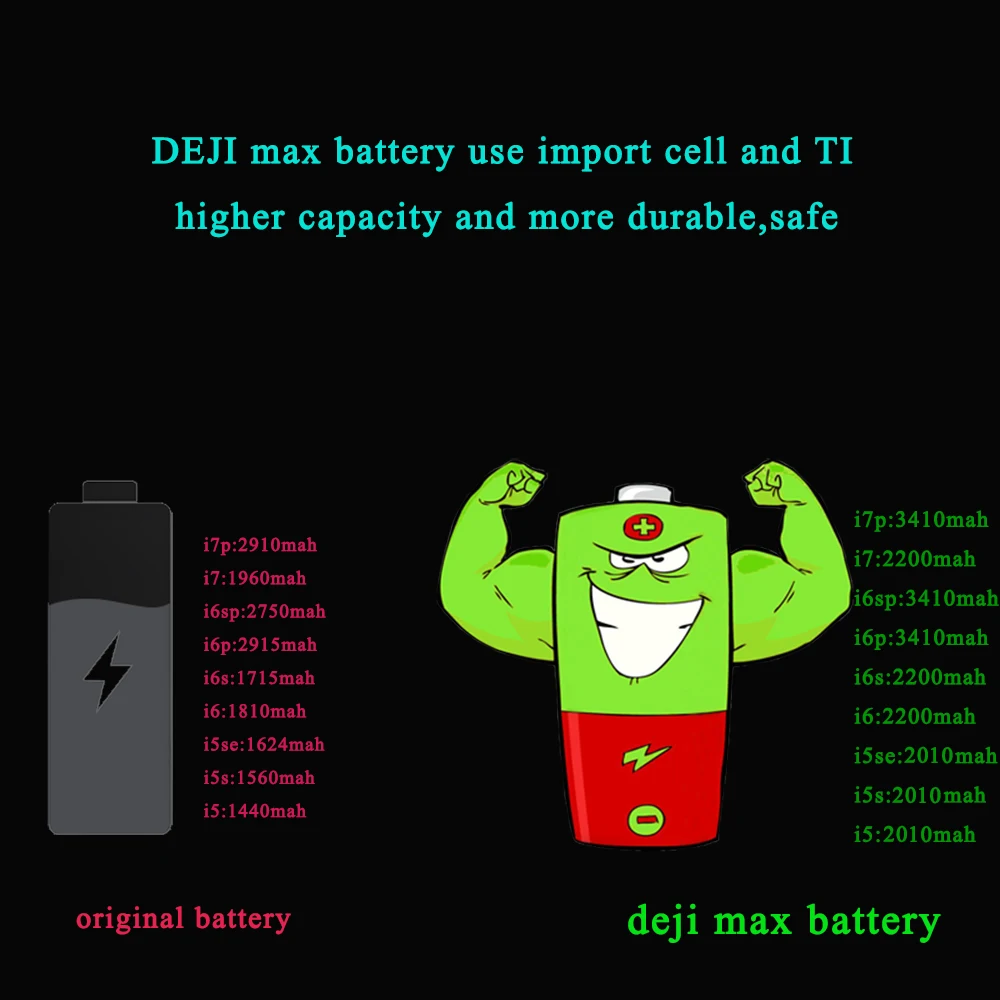 1) новый аккумулятор 0 цикла, более прочный, сверхреальная Емкость 2) Используйте схему Tl, которая подходит для системы iso-контроля 3) идеальный процесс производства, Защита от перегрева, защита цепи, Входное перенапряжение, защита от перегрузки по току, Защита от перенапряжения на выходе, защита от обратного тока на входе, Батарея перезаряда Protetion Аккумулятор DEJI для iphone se, 2010 мА · ч, оригинальный аккумулятор 1624 мА · ч. Выше, чем емкость 386 мАч. Аккумулятор DEJI для iphone 5, 2010 мА · ч, оригинальный аккумулятор 1440 мА · ч. Выше, чем емкость 570 мАч. Аккумулятор DEJI для iphone 5s, 2010 мА · ч, оригинальный аккумулятор 1560 мА · ч. Емкость выше 450 мА · ч. Аккумулятор DEJI для iphone 6, 2200 мАч, оригинальный аккумулятор 1810 мАч. Выше, чем емкость 390 мАч. Аккумулятор DEJI для iphone 6s, 2200 мАч, оригинальный аккумулятор 1715 мАч. Выше, чем емкость 485 мАч. Аккумулятор DEJI для iphone 6 plus, 3410 мА · ч, оригинальный аккумулятор 2915 мА · ч. Емкость выше 495 мА · ч. Аккумулятор DEJI для iphone 6s plus, 3410 мА · ч, оригинальный аккумулятор 2750 мА · ч. Выше, чем емкость 660 мАч. Аккумулятор DEJI для iphone 7, 2200 мА · ч, оригинальный аккумулятор 1960 мА · ч. Выше, чем Емкость 240 мАч. Аккумулятор DEJI для iphone 7p, 3410 мА · ч, оригинальный аккумулятор 2910 мА · ч. Выше, чем емкость 500 мА · ч.