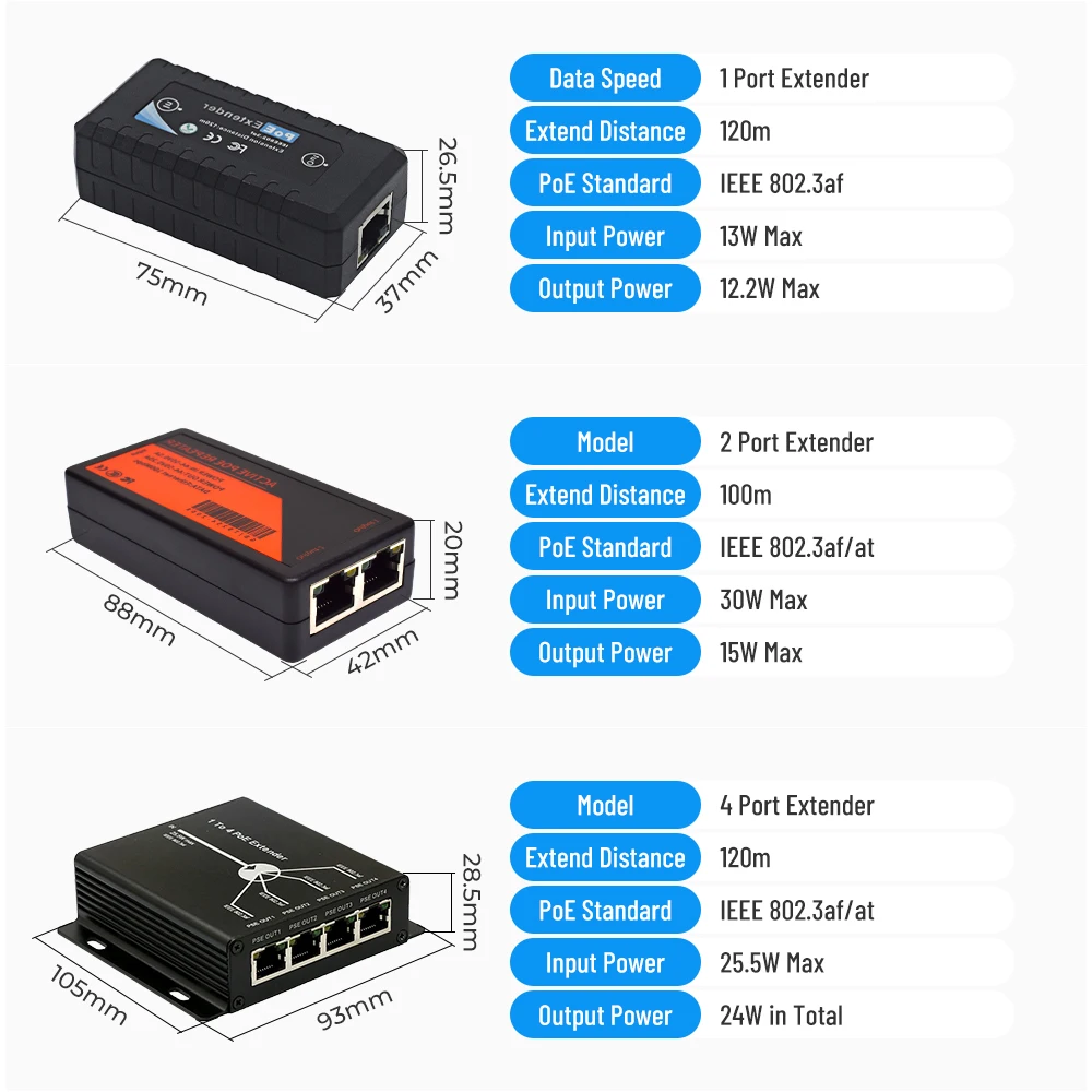 Расширители PoE могут увеличить расстояние передачи Данных Ethernet и мощность PoE до 120 м через кабели Cat5 UTP. Он предлагает вам большую гибкость для расширения расстояния PoE