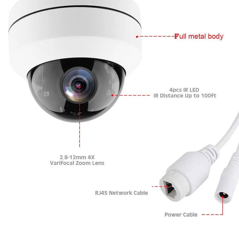Купольная мини-камера со встроенным PoE ONVIF2.4/RTSP; Поддержка функции P2P Поддержка сжатия H.264 /H.265 Панорамирование, наклон, зум, сканирование на предмет соответствия, Возможность поворота Совместим с HIKVISION ,DAHUA, XM NVR Совместимость с платформой Milestone, NUUO и AXXON 8,0 м: ip-камера 3516A + SONY3334(H.265) 5 Мп: ip-камера 3516E + SONY335 (H.265) 2 Мп: ip-камера 3516E + SONY307 (H.265) Объектив: 4X = 2,8-12 мм D/N: IR-CUT BLC: Auto WB: Авто Отношение S/N: >50 дБ Протокол связи: TCP/IP, httpp, NTP,IGMP, DHCP,UDP,SMTP,RTP,RTSP,ARP,DDNS,DNS,PPPoE,P2P Программное управление: IE, CMS, платформа управления Мобильный вид (опционально): Android / iPhone Диапазон сковороды: 0 °-355 ° Диапазон наклона: 0-70 ° Скорость сковороды: 0-25 °/С Скорость наклона: 0-20 °/С Заданные точки: 220 Охранные туры: 3 группы (каждая из 16 предустановленных групп, точное время и скорость на выбор) Защитные очки: макс. 16 точек, Время в режиме ожидания на выбор Дальность сканирования AB: любой диапазон точек: 0 ° ~ 70 ° и 0 °-355 ° Скорость сканирования AB: 1-9 уровней Рабочая температура: наружная: -30 ℃ ~ + 60 ℃ Операционная система menuанглийская ИК-светодиодный дисплей с автоматическим управлением: ШИМ Поддержка обнаружения окружающего светильника: инфракрасное освещение на 1-15 сортов на выбор ИК-расстояние: до 100 футов Humidity≤ 95%, без конденсатора Расход ≤ 10 Вт Защита от молнии: переходное напряжение 3000 в Одобрение: IP66,CE,FCC,RoHs Вес: NW: 0,55 кг GW: 0,67 кг Эта ip-камера 2 МП/5 Мп имеет бесплатное приложение: «Hisee», идентификатор входа-admin, пароль-admin. Упаковочный лист; 1 * Антивандальная купольная ip-камера 1 * CD 1 * Руководство пользователя