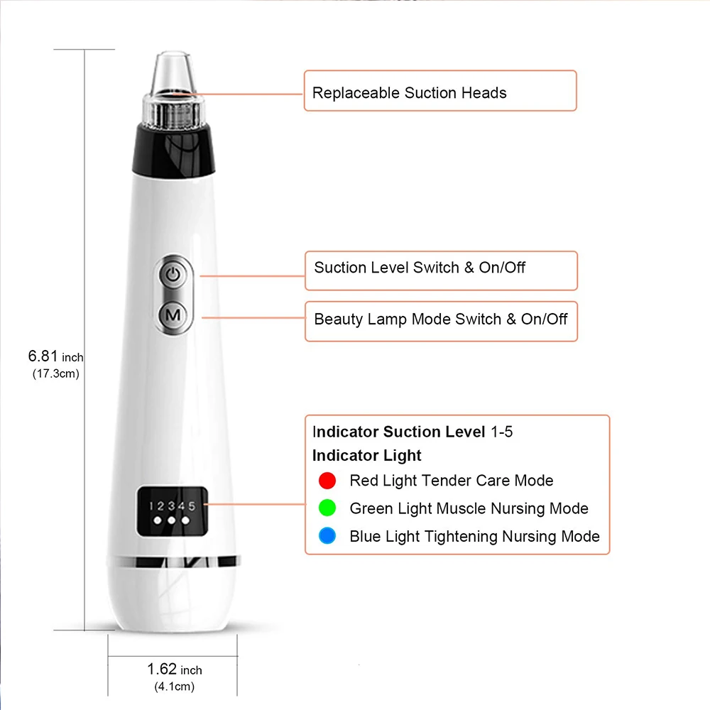 Регулируемый очиститель пор: оснащен четырьмя присосками для быстрой регулировки: мягкий, нормальный, массажный, супер, таким образом, очиститель пор подходит для нескольких типов кожи.