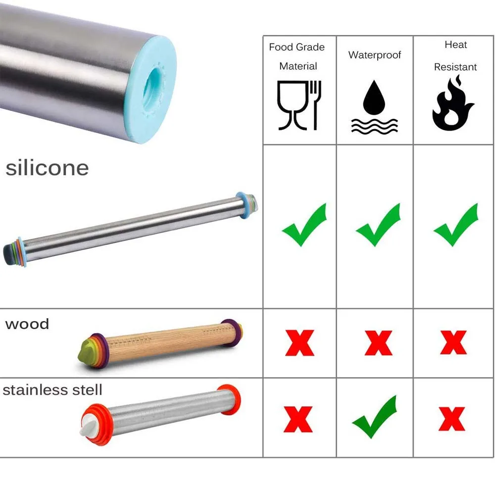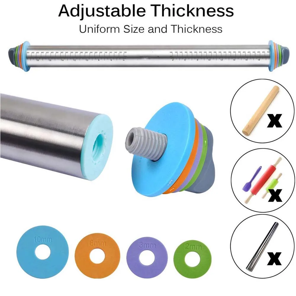 Легко Отрегулируйте ширину и толщину теста-регулируемый штифт поставляется с 4 съемными направляющими по толщины (1/16 дюйма, 1/8 дюйма, 1/4 дюйма и 3/8 дюйма на выбор) И есть измерения в сантиметрах и дюймах на каждом конце рулонного штифта, которые будут равномерным выравниванием теста для обеспечения равномерной выпечки. Точное измерение и удовлетворение различных потребностей выпечки-измерение на каждом конце роликового штифта будет измерять точное длину и ширину теста. Цветные кольца 2 мм, 3 мм, 6 мм, 10 мм разобьют желаемую толщину, что отвечает различным требованиям выпечки. Универсальный и антипригарный -- катящийся штифт с толстыми кольцами, антипригарный и идеально подходит для помадки, печенья, домашней пиццы, кондитерских изделий во французском стиле, пирога, свежих печенья и пельменей, корок, пирожные, чайные торты для свадьбы, украшения королевской глазури, вопли масла и многого другого.