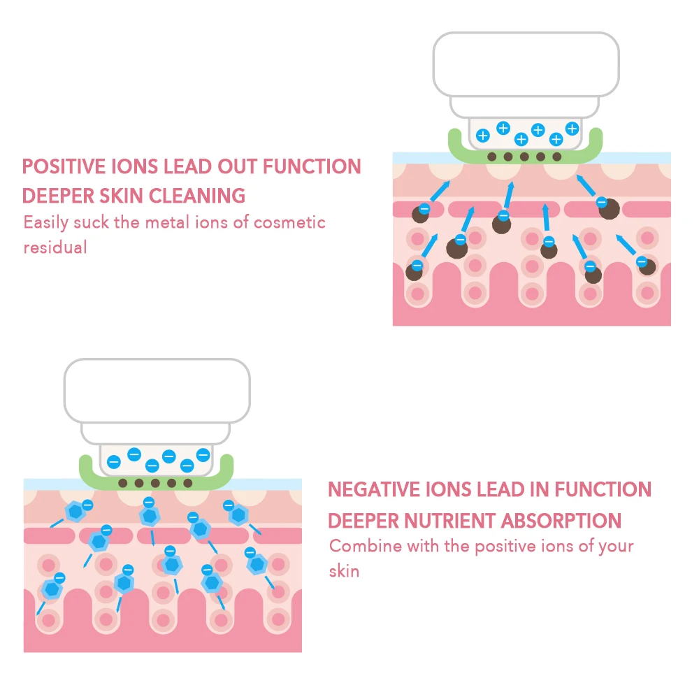 1. Режим очищения и осветления кожи: функция извлечения положительных ионов обеспечит более глубокое очищение кожи в сочетании с моющим средством, легко удалит косметические металлические ионные остатки, которые могут быть вредны для вашей кожи; функция отрицательного ионного свинца позволит Вашей коже глубоко впитывать питание для более эффективного ухода за кожей.