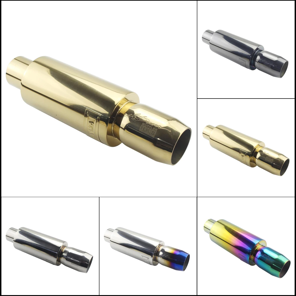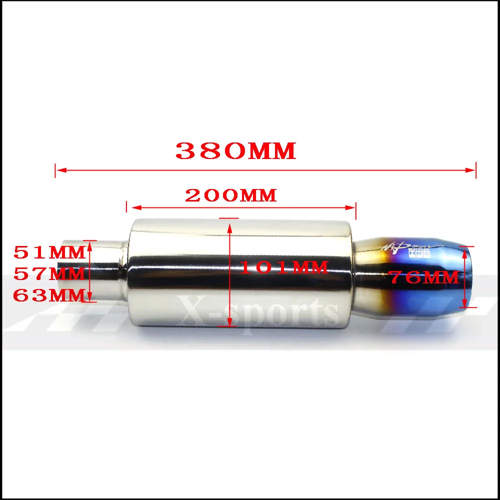Название продукта: выхлопная труба Подходит для: Универсальный Материал: высококачественная нержавеющая сталь Размер корпуса барабана: 200 мм * 101 мм Размер интерфейса: 51 мм 57 мм 63 мм Экспортный Размер: 76 мм Длина: 380 мм Цвет: серебристый синий красочный золотой титан