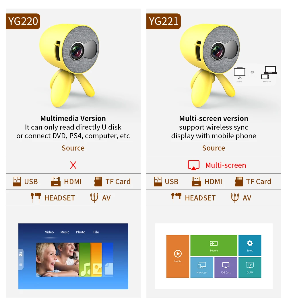 Модель: YG-220/YG-221 Коррекция Keystone: нет Оптическое разрешение: 480x272dpi Использование: проектор для развлечения Тип штекера: вилка европейского стандарта Тип штекера: вилка стандарта США Тип штекера: штепсельная вилка австралийского стандарта Тип штекера: штепсельная вилка стандарта Великобритании Мощность: 30 Вт Проекционный режим: метательный Шкала экрана: 16:09 Проектор для домашнего кинотеатра: нет Вес: 0,628 кг Цифровой зум: фокус Проекционное расстояние: 1,5-3,5 метр Портативный: Да Светильник источник света: светодиодный Проекционная технология: светодиодный Контрастность: 1000:01:00 Номер модели: YG220/YG221 Разрешение: 480*272 Максимальная поддержка 1920*1080P Проекционное отношение: 1,5: 1 Вход и выход: HDMI,USB,Micro SD ,AV и наушники Вес и размер: 628 г, 146*110 мм