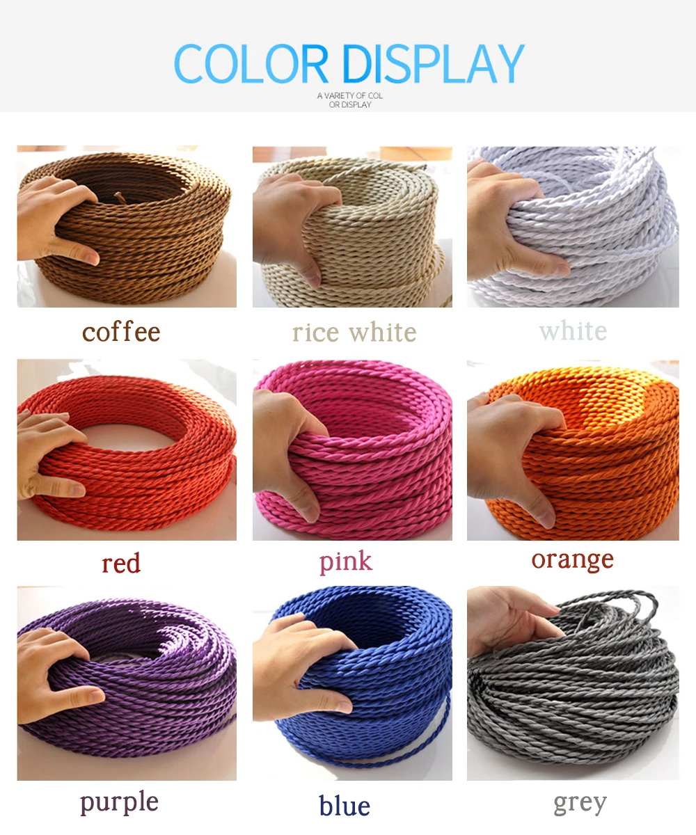 Информация о продукте Название продукта: электрический провод Стиль: винтажный Напряжение: 90-260 В переменного тока (для всех стран) Номинальная сила тока: 8 Ампер Двухжильный кабель из витой ткани 2 × 0,75 мм ² Длина: 1 м 2 м 5 м 10 м 20 м 50 м Цвет: черный/белый/золотой/серый/фиолетовый/оранжевый/кофейный/желтый/голубой/розовый/зеленый/красный/синий Этот набор шнуров подходит для проводки или перезарядки старинных или винтажных ламп, а также для вентиляторов и небольших приборов, где вы хотите подлинный и аутентичный винтажный вид. Гибкий плетеный электрический шнур предназначен для использования в бытовой технике, включая лампы, подвесные Подвески, вентиляторы и офисное оборудование.