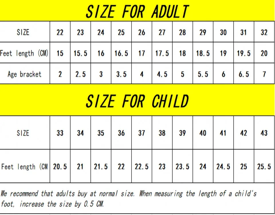 У нас есть 2 типа обуви. Пожалуйста, внимательно проверьте это. Один размер для взрослых (размер 33-43) и другой размер для детей (Размер 22-32)