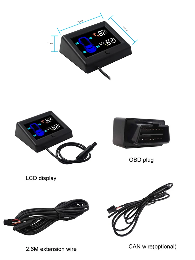 1. Дизайн OBD (подключается к автомобилю OBD для считывания данных компьютера автомобиля и источника питания к ЖК-дисплею) 2. Не нужно устанавливать датчик на шинах (установка датчика один аккумулятор используется только в течение одного года или меньше, и трудно изменить батарею) 3. Только 5 минут может закончить установку (за исключением одного провода)