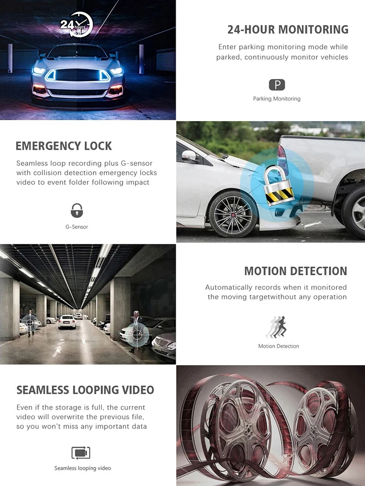 После того, как функция мониторинга парковки запущена, в случае парковки и огня, когда корпус транспортного средства изолирован внешней силой, регистратор автоматически запустится и запишет в течение 60 секунд, И автоматически выключается после блокировки. В настоящее время записанное видео является защищенным файлом и не будет перезаписываться по кругу. (После того, как эта функция включена, отформатируйте SD-карту с приложением один раз в неделю, чтобы избежать чрезмерного Занятия места из-за блокировки файлов, в результате чего диск переполнен и не может записать)