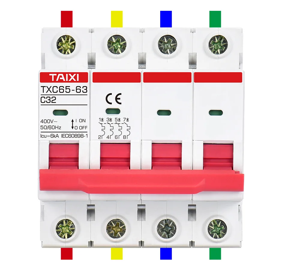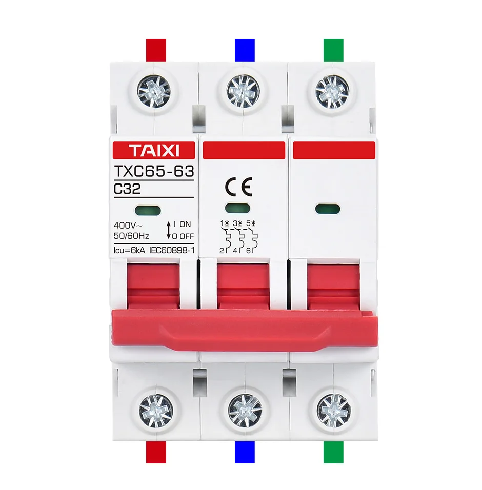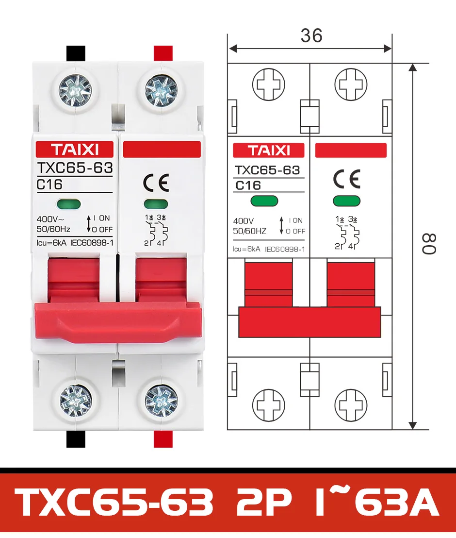 TXC65-63 6KA автомат защити цепи (также называется 6KA бытовой переменного тока выключатель, похожие на CHINT NB1-63) используется для цепи переменного тока 50 Гц, Номинальное напряжение: 110V/230/400V, номинальный ток 1A, 2A, 3A, 6A, 10A, 16A, 20A, 25A, 32A, 40A, 50A, 60A, 63A для защиты от перегрузки и короткого замыкания, а также для использования в нормальных условиях нечастого преобразования цепи, также используется в качестве изолирующего выключателя для цепи отключения для защиты цепи и оборудования.