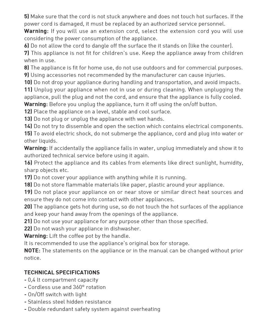 Sinbo SCM-2943 elektrikli cezve Sinbo SCM-2943 türk kahve makinesi-Inox; это ozel olarak tasarlanmыssyr kolayca hazir tularak kahve. Sinbo SCM-2943, çok başarılı sayesinde его özel Регулируемый ısıtma hızı yakalamak için doğru tutarlılık ve köpüklü geleneksel турецкие kahve lezzet; yapar pratik hazırlamak için kahve evler, большие aileler, işyerleri. Sinbo SCM-2943 tulk kahve makinesi ozellikleri Inox gri renk ekler şk ve современный atmosfer to mutfak dekorasyon. Sahiptir yuksek malzeme kaliteli ve uzun omhurlju yuksek kaliteli paslanmaz chelik gёvde. Sahiptir capasiteli hazirlamak ichin tulk kahve 5 bardaklar. Это tasarrufu kullanici en sorun hazirlama uzun vadeli kahve bile en yoaguun guln. Йок герекир Иль Баша чыкмак ichin birden fazla cezve. Это sa≤lar ucretsiz kullanim ile taban ve kablosuz ve 360 ° dønen yapxysi. Vücut makine çıkarılabilir olarak istenen. Бёйлис, Йок дёкюльме сirasinda kahve dёkulhur ichine gёzlhuk. Ayni anda vulcut kolayca yikan. Paslanmaz celik gizli direnci, Sinbo SCM-2943 дегил денейм кальцификация. Direnç bir fiyata gizli yapxysi, saΩ lanmasi bu it gerekmez temizleme bile ichin kullanыldыldыnda yыl. Sahiptir для мужчин и женщин. Durumda unutulmuş, термостат, aktif заман его ulaşır 135 ° C ve термальный sigorta, aktif заман его ulaşır 156 ° C. Желчь kahve makinesi güç anahtarı, döner kendini ve sağlar güvenlik из kullanıcı. Isıtma hız ve güç vardır göre ayarlanmış geleneksel yöntemler. Это гарантированно ayni derinligan I her kahve ve tadi geleneksel Turk kahvesi chuk kёpulk. Sinbo SCM-2943 tulk kahve makinesi chekmece dikkat ile teknik ozellikleri. Бардак капаситеси: 5 Ренк: Inox Термостат: evet Масса: 1000 Вт Капасит: 0,4 л