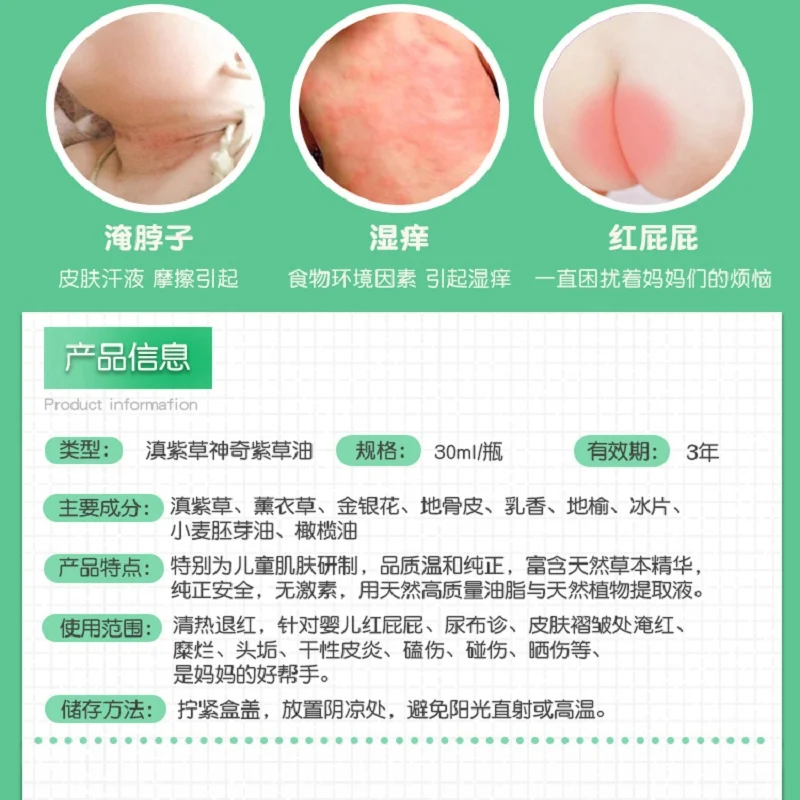 Название продукта: очищенное литоспермовое масло Спецификация: 30 мл/бутылка Срок годности: 3 года Основные ингредиенты: Llithospermum, лаванда, жимолость, кортекс Lycii, mastic, sanguisorba, borneol, масло зародышей пшеницы, оливковое масло Особенности: специально разработанная для детской кожи, мягкое качество, богатая природной травяной эссенцией, безопасная и без стимуляции, без гормонов, использование натуральных высококачественных масел и растительной эссенции Диапазон применения: очистка тепла, снятие покраснения, предназначено для детских красных околов, опрелостей для подгузников, покраснение кожных складок (покраснение/Зуд/боль/язва кожи из-за горячей и влажной/герметичной/потной в положении складок кожи), сухая экзема, синяки, раны, солнечные ожоги Хранение: затяните крышку, поместите ее в прохладное место, вдали от прямых солнечных лучей или высокой температуры